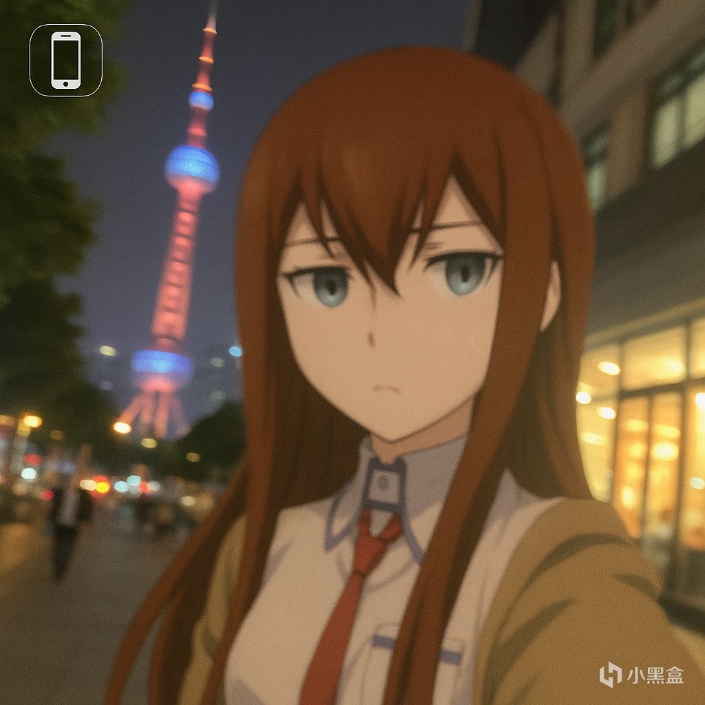 請你畫一張極其平凡無奇的iPhone自拍照,沒有明確的主體或構圖感-就像是隨手一拍的快照,照片略帶運動模糊,陽光或店內燈光不均導致輕微曝光過度,角度尷尬、構圖混亂,整體呈現出一種刻意的平庸感-就像是從口袋裏拿手機時不小心拍到的一張自拍。主角是二次元角色牧瀨紅莉棲,直接以二次元形象出現,夜晚,在上海,有上海塔