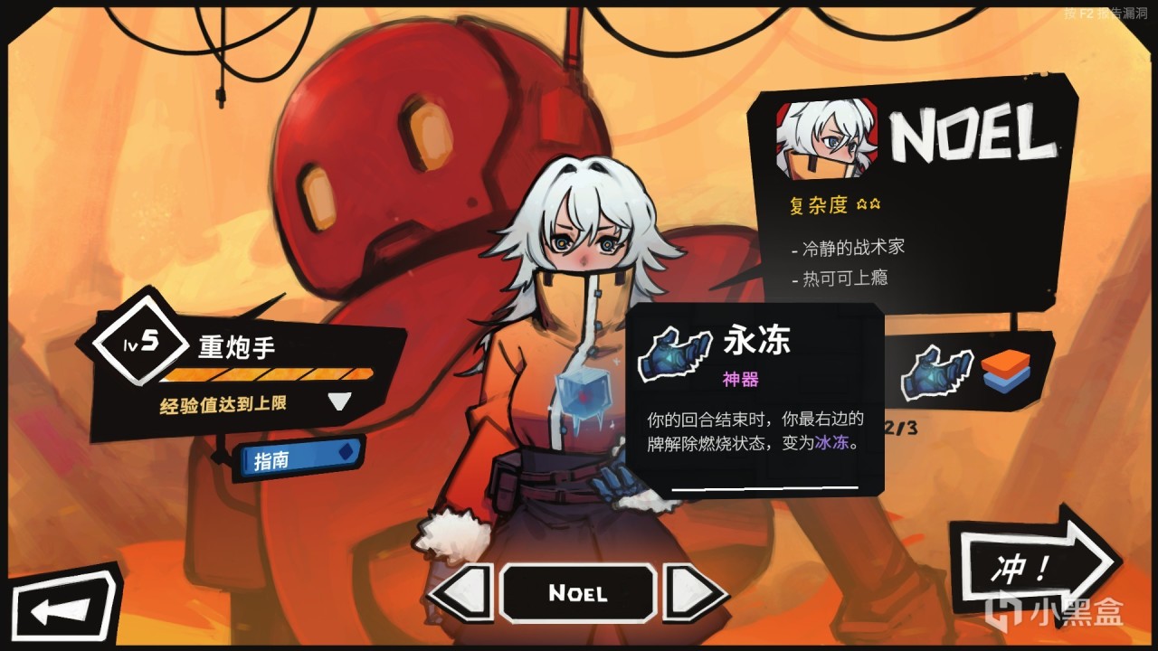 第一個機甲是“重炮手”,其打出牌後會獲得“熱量”,熱量滿了之後再次使用卡牌會進入“過熱”狀態,會導致卡牌被燃燒本局不再可用。