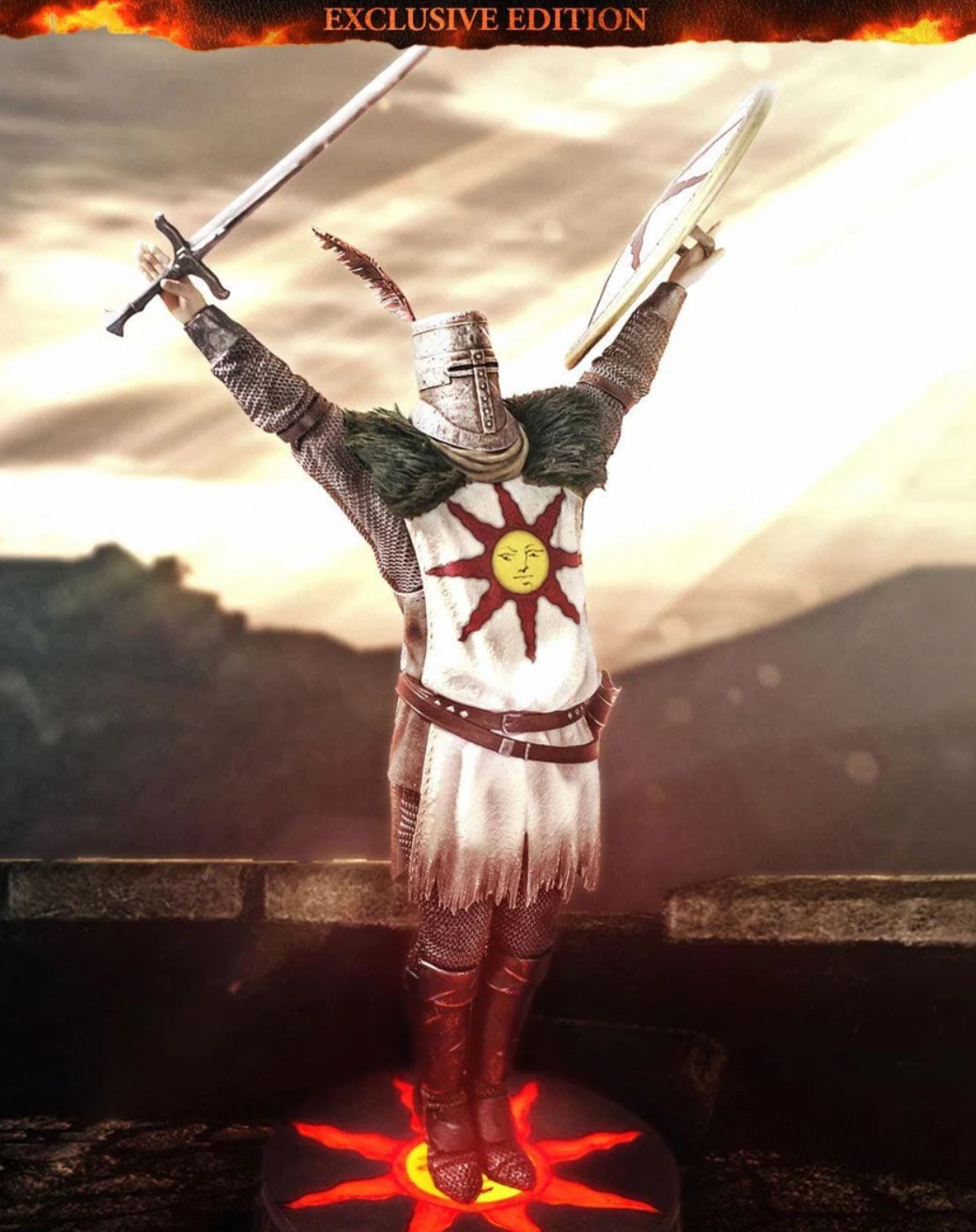 這尊雕像描繪了只狼的動態姿態,右手握着【楔丸】,揹負着【不死斬】。