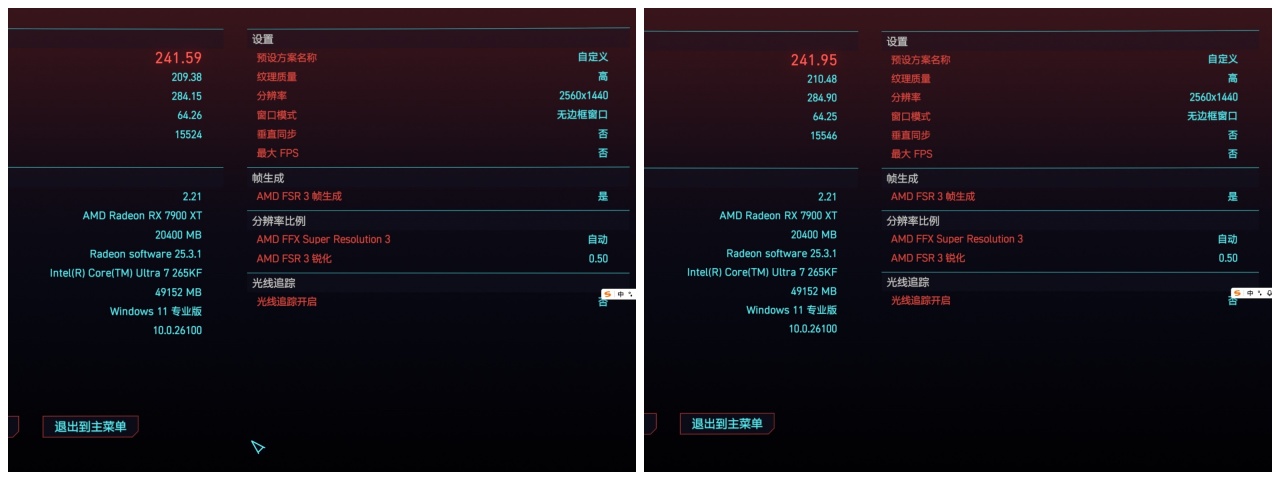 首先是赛博朋克2077,实测在2K分辨率高画质下,启用FSR3和帧生成,两者均可以达到240帧的水平,相差无几。