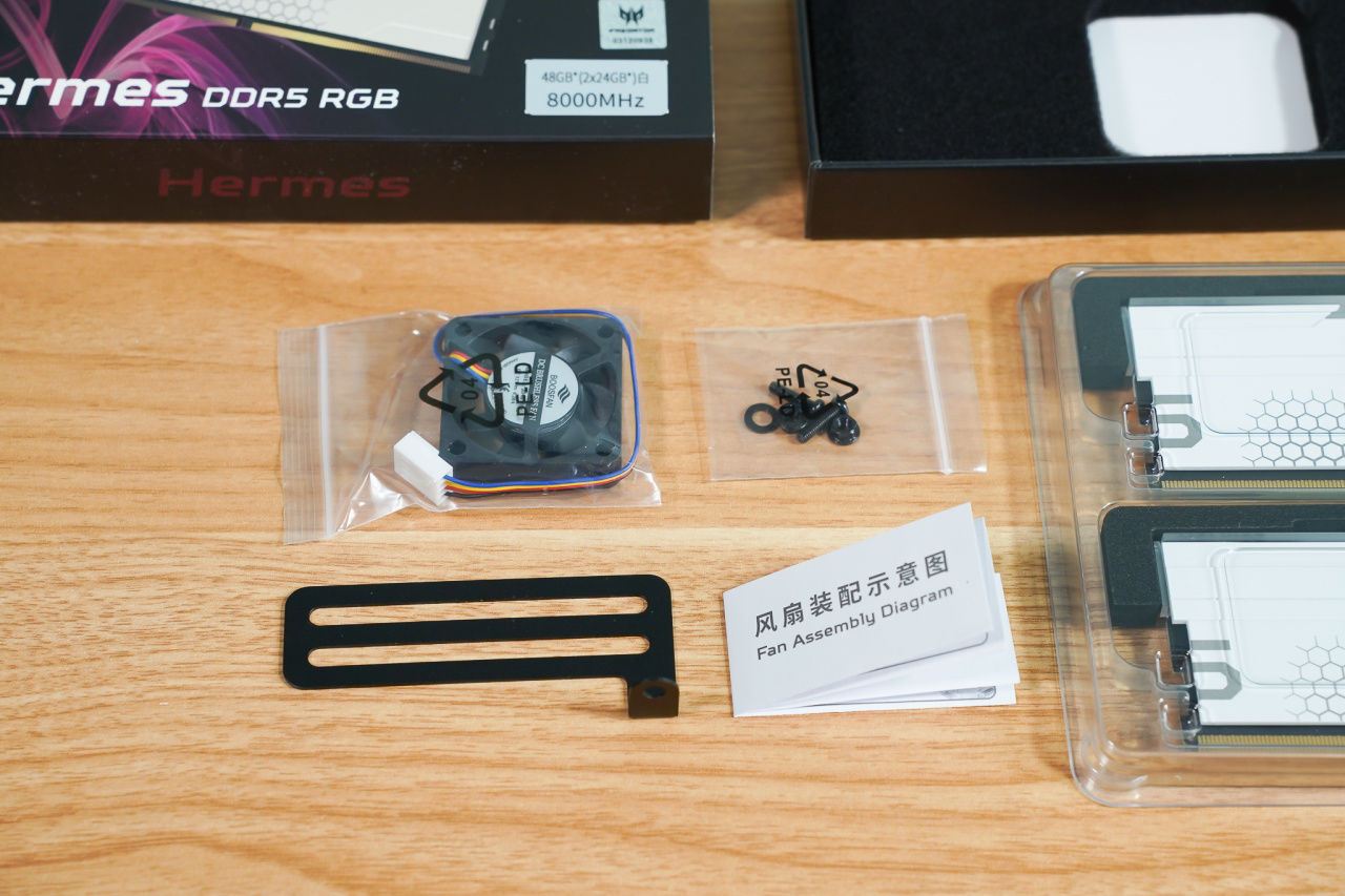 同时,包装盒里它还包括风扇套件。这是定制的40mmx40mm的内存风扇,4.72CFM风量直吹,高频运行更加稳定。按照说明书可以轻松安装在主板上面 。