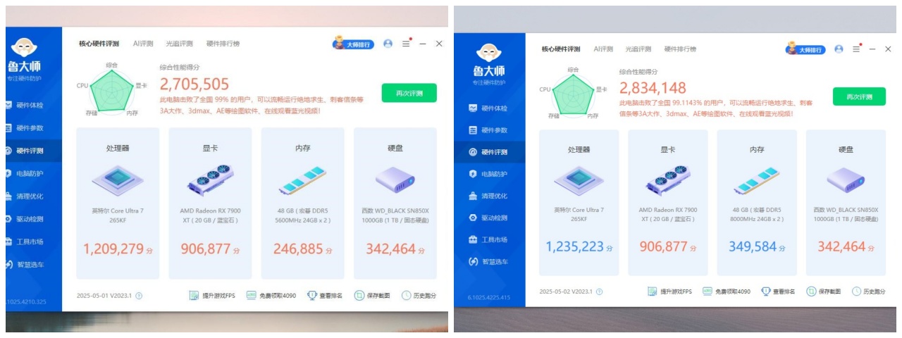 首先来看看鲁大师的对比,默认配置下鲁大师测试CPU分数120.9279万,这个表现也是很强劲的。内存分数24.6885万分。启用Boost后,CPU分数提升到了123.5223万分,而内存的分数也提升到了34.9584万分。总体分数从270.5505万提升到了283.4148万分。