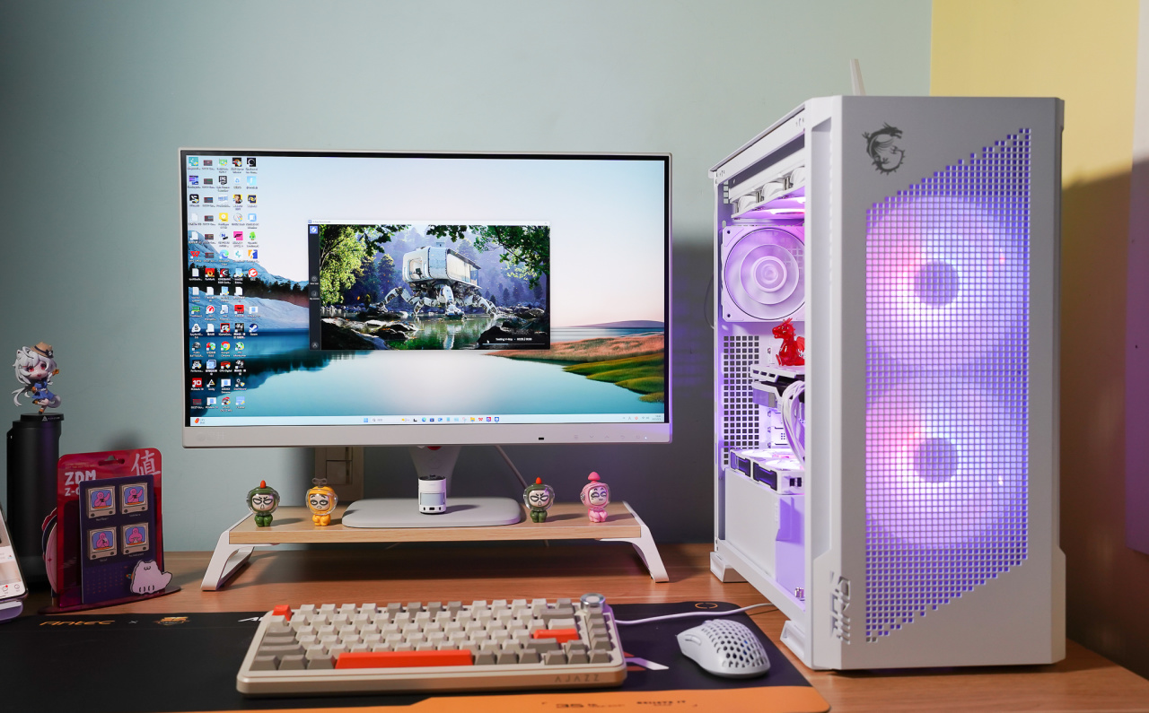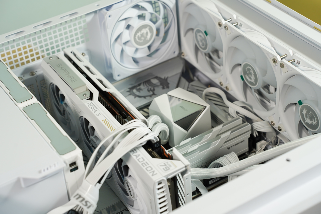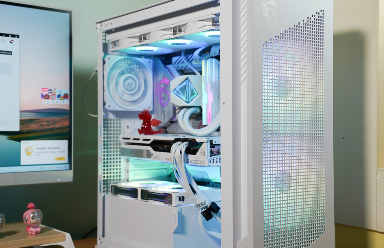 接好线启动电脑,顺利进入了系统。我们看机箱是一只传统风格的中塔机箱,这是微星最近新出的MPG VELOX 300R AIRFLOW PZ WHITE。它散热设计优秀,具有传统的横向风道设计,同时支持竖向风道。它出厂配置有2个前面板160mm大风扇,后面1个120mm风扇,均为独特的双层风扇,通风散热效果更佳。它支持前面板和顶部面板360mm水冷,全机箱最多可安装13个风扇。支持E-ATX、ATX、M-ATX、ITX多种规格的主板,更支持ATX规格的背插主板,适应性广。带有显卡支架,具有各种免工具拆卸设计,包括电源仓也可以拆下,安装方便。
