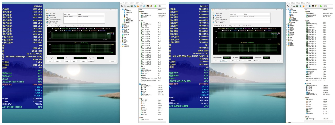 我们通过AIDA64 FPU压力测试,来看看这款CPU的表现如何。无论在默认模式下还是开启Boost之后,功耗均在接近230W的样子。而从频率看,开启Boost后的频率,大核全部在5.2G,而在默认模式下,大核是部分5.2G,部分5.1G,说明开启后性能提升了。而温度方面,反而开启Boost后温度更低一些,说明Boost功能对于CPU进行了优化,电压更低。