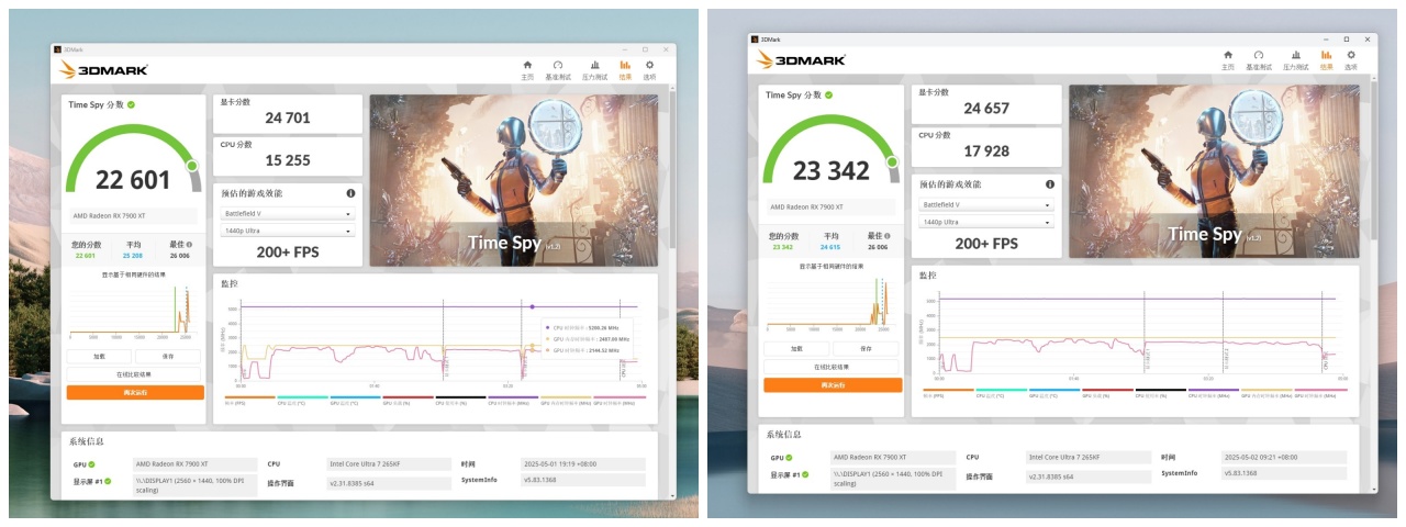 3DMARK Time Spy测试,默认配置下总分22601,其中CPU得分15255。启用Boost后总分23342,CPU分数17928,那么无论是CPU分数还是总分都有所提升。