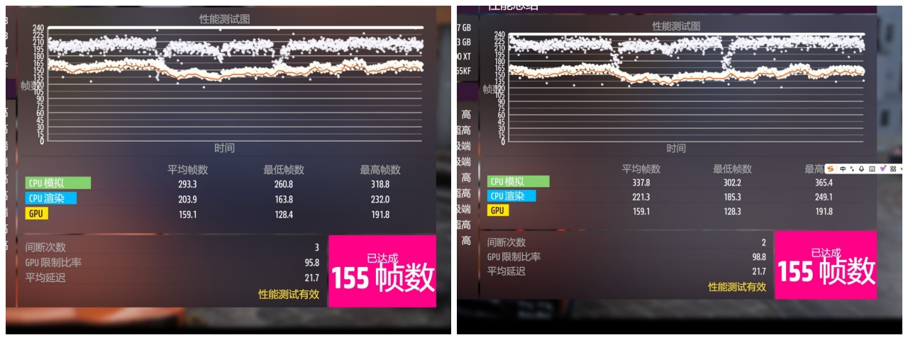 地平线5,这里可以分别看出显卡和CPU的表现。默认配置时CPU模拟是293.3帧,CPU渲染是203.9帧;而开启Boost后,CPU模拟是337.8帧,CPU渲染是221.3帧,提升幅度在10%左右。