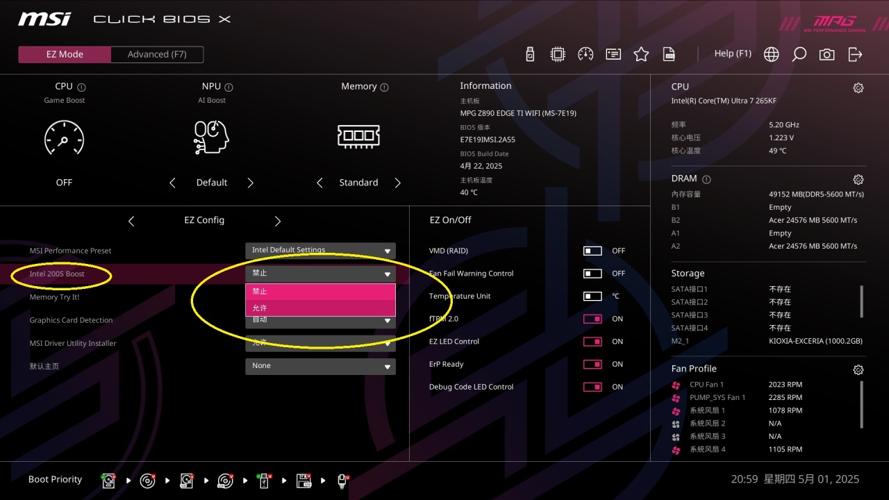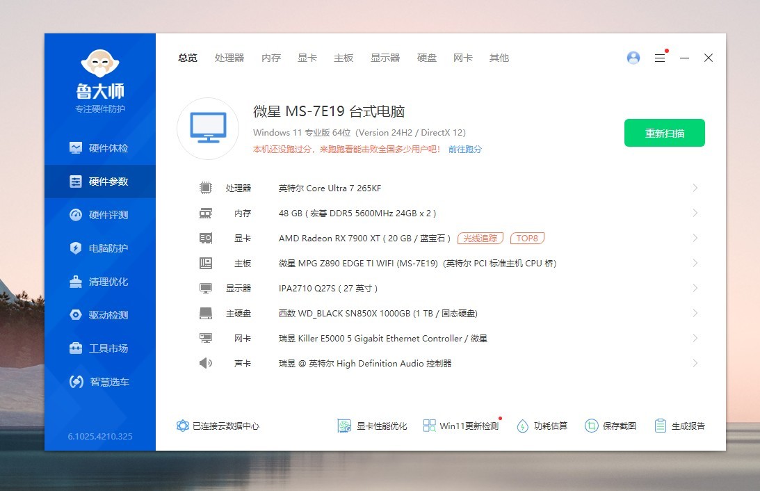 看看电脑的配置,同刚才展示的相同,CPU是英特尔Ultra 7 265KF,内存是宏碁DDR5 5600MHz,工作在默频上,显卡是蓝宝石7900XT 20GB,主板是微星MPG Z890 EDGE TI WIFI。