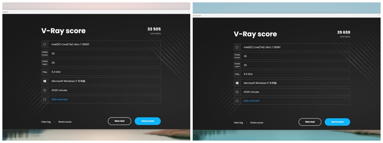 V-RAY测试,默认配置下33505,启用Boost后是35659,生产力提升了不少。