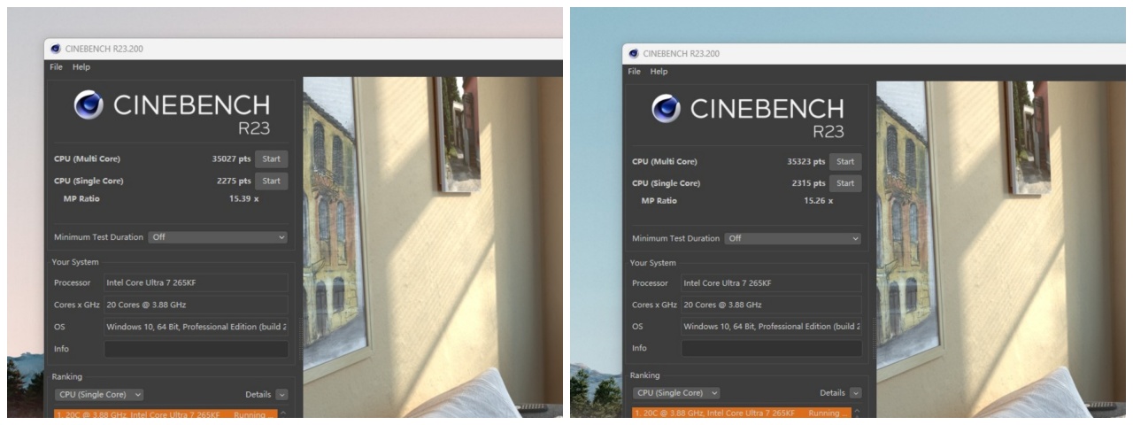 CINBENCH R23,默认配置下 多核35027,单核2775。启用Boost后,多核35323,单核2315,均有所提升。
