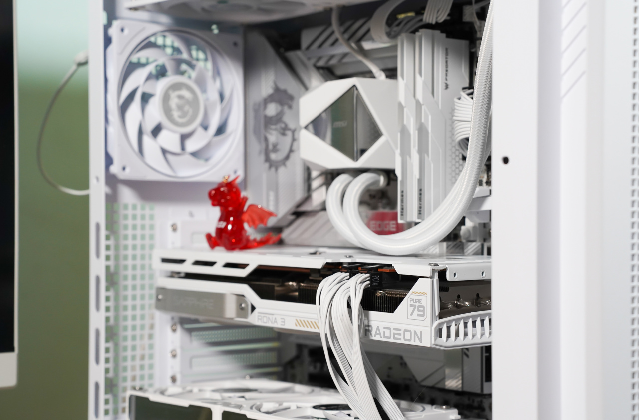 显卡是蓝宝石的白色RX 7900XT 20G D6极地版OC,采用RDNA 3架构,整体白色。它的技术指标:流处理器5376个,共84 CUs,加速频率2450MHz,游戏频率2075MHz。配备20GB的GDDR6显存,位宽320 bit。它采用了14层PCB,保证电气性能。6根复合式热管,加厚散热鳍片,实现更好的散热。三个白色双滚珠轴承风扇,寿命更长,扇叶是著名的飞翼轴流扇叶。