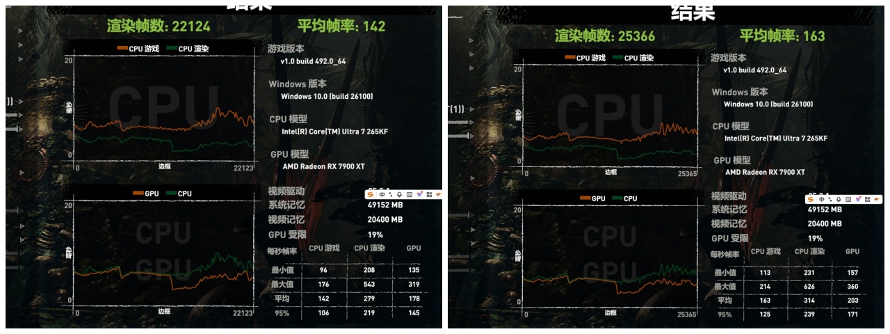 古墓丽影.暗影测试,在2K分辨率下,CPU游戏142帧,CPU渲染279帧,GPU178帧。启用Boost后,CPU游戏163帧,CPU渲染314帧,GPU203帧,启用之后更方面均有提升。