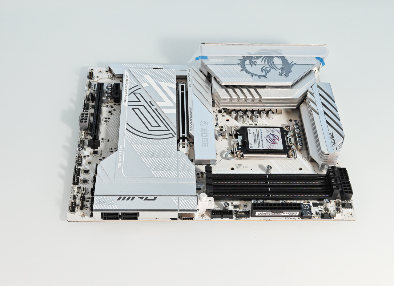 主板使用的是微星的MPG Z890 EDGE TI WIFI刀锋钛主板,这款主板是白色主板,非常漂亮,底色是白色的,同时有大面积的银白色的散热装甲。同时它的供电强大,使用了16+1+1+1相90A 供电设计,应对顶级的英特尔CPU也毫无压力。散热方面,VRM散热上面覆盖着两个超大的褶皱式金属散热鳍片。通过一根内置热管链接,还配备了7W/mK的高效导热垫,可以更加有效地传导热量。