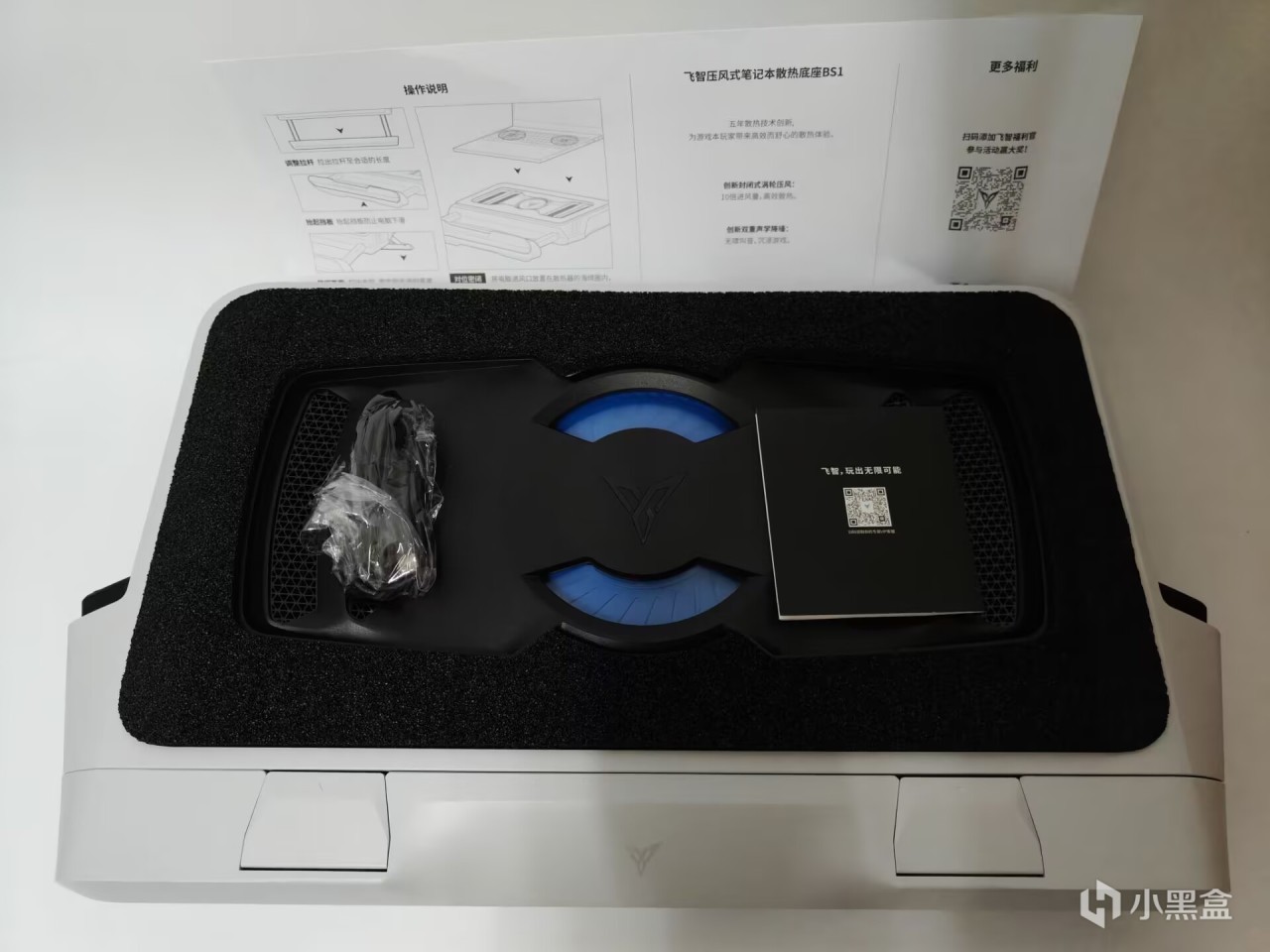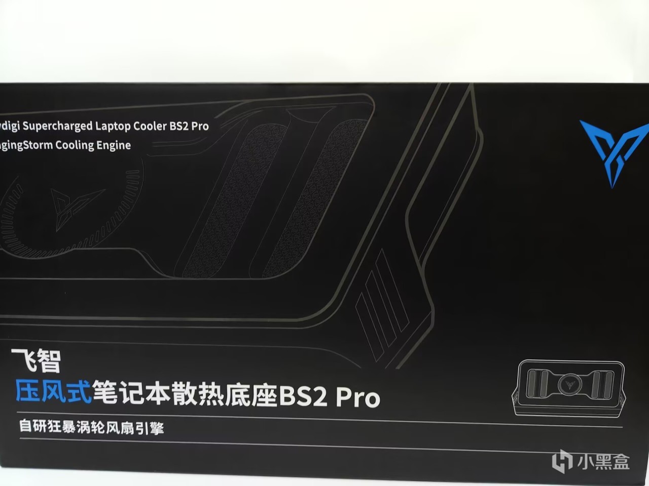 快遞到手這個大小就嚇我一跳,箱子真夠大的,倒也可以說是用料足(,快遞紙箱下就是飛智祖傳設計,黑色的箱子上右下角爲設備剪影,左下角是設備名,小到手機散熱器,大到筆記本散熱器都是一樣的設計,就算去掉logo和名字也一眼能認出來這是飛智的設備。