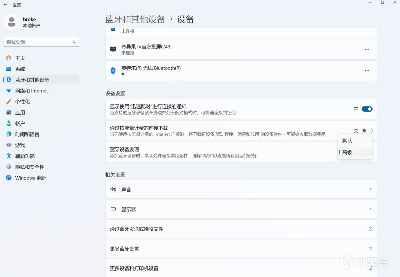 但是藍牙連接的時候有個問題,windows默認藍牙設備只能識別手柄、耳機、鼠標這些設備,你藍牙搜索會發現根本搜不到BS2PRo 的藍牙設備,這時候需要進入藍牙設置選擇顯示更多設備,然後拉到最下面,把藍牙設備從默認改爲高級就可以搜到了。