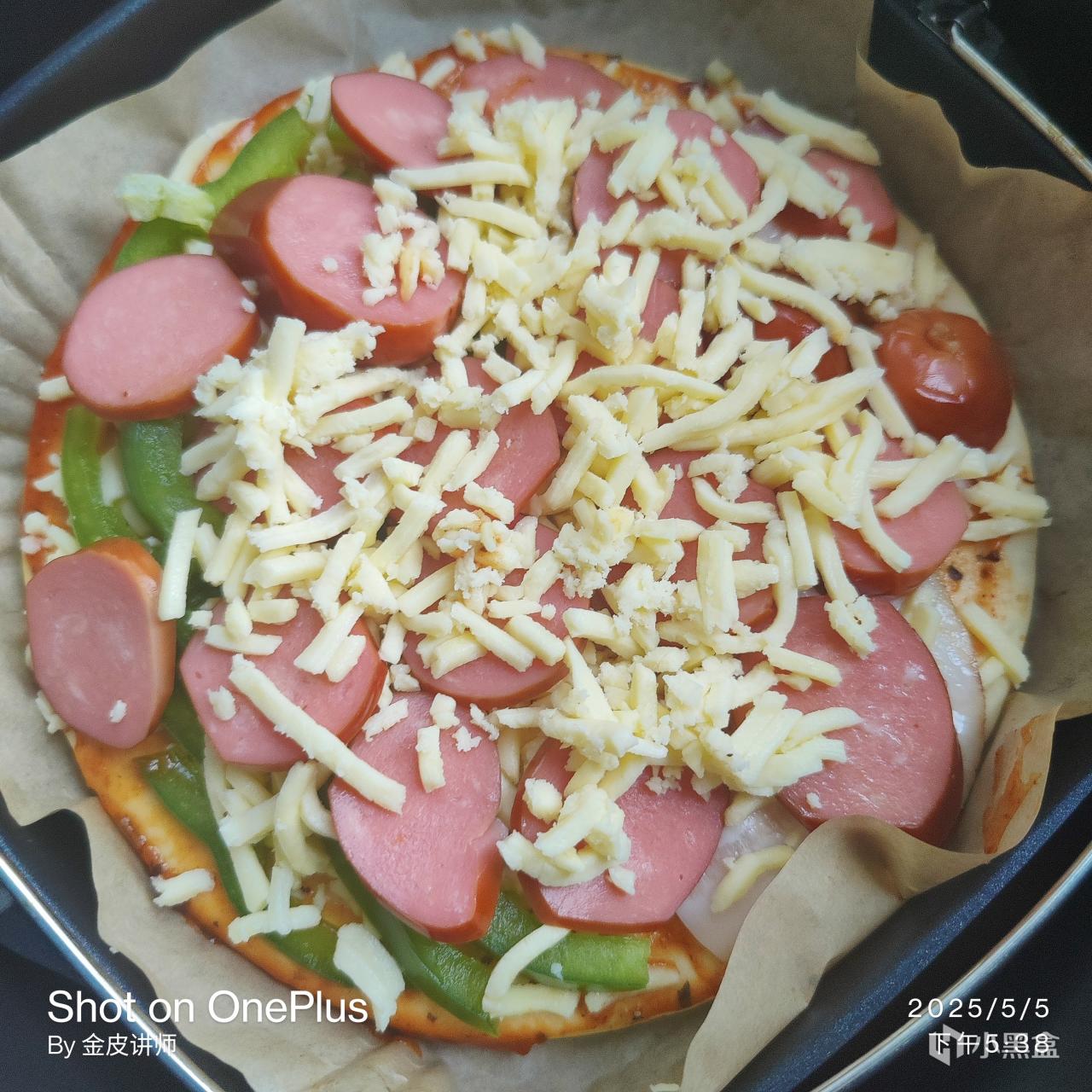 ①將鋪好餡料的披薩放入空氣炸鍋,用180度烤制8分鐘。