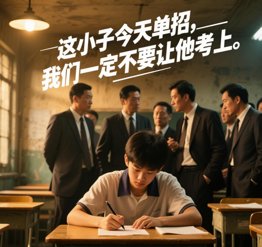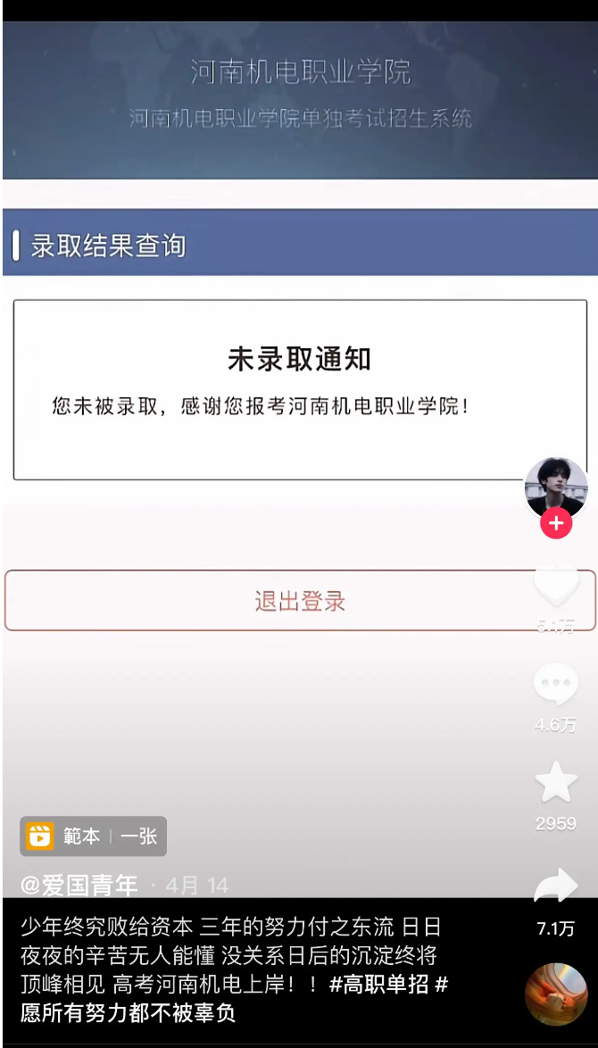 然而,即使如此努力,卻還是功虧一簣,資本的佈局讓他和大專失之交臂。也許是資本家想讓自己的兒子上這所大專,所以他站在陸家嘴中心大廈100層,用望遠鏡瞄到了河南這位努力的老鄉,然後想盡一切辦法讓他遺憾落榜。