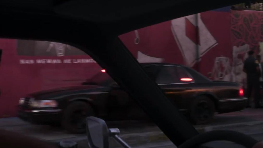 在预告片同一时间出镜的还有一辆通体黑色的威皮·史塔尼亚 无标识巡航者,注意这辆无标识巡逻车并没有像5代那样安装外置防撞杠和探照灯,而且中网格栅也是早期生产型(约98-02)的镀铬样式. 不过这辆史塔尼亚的轮毂就比较抽象了,其风格不像是警用型号会安装的.