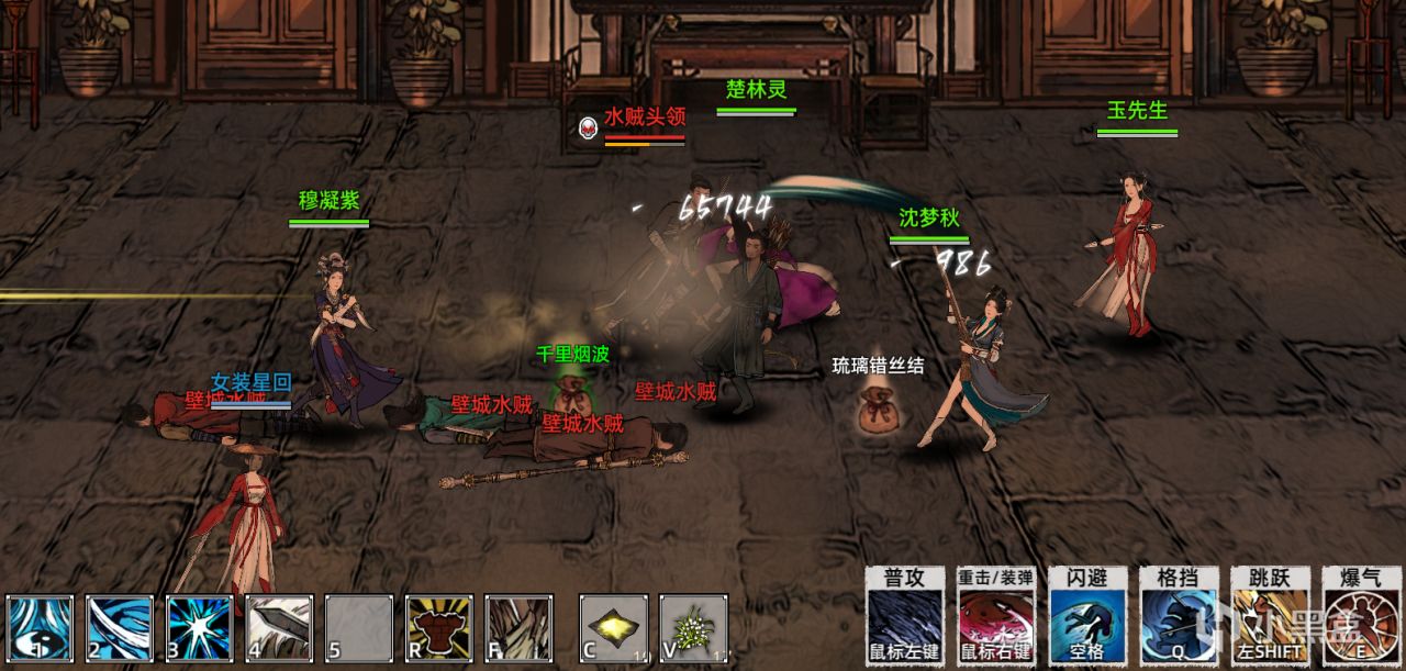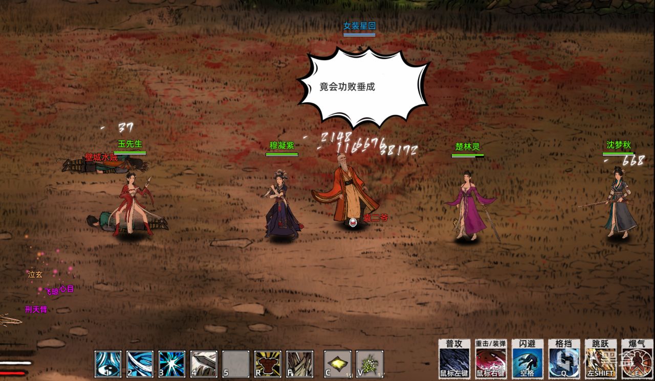 最後來聊一下《刀劍江湖路》的橫版戰鬥,本作的戰鬥模式有些類似於DNF的感覺:進入一個單獨的戰場,開始橫軸俯視角ARPG,根據你選擇的武器,可以完成輕&重擊和1234技能,還可以用Q完成格擋(和彈反)。