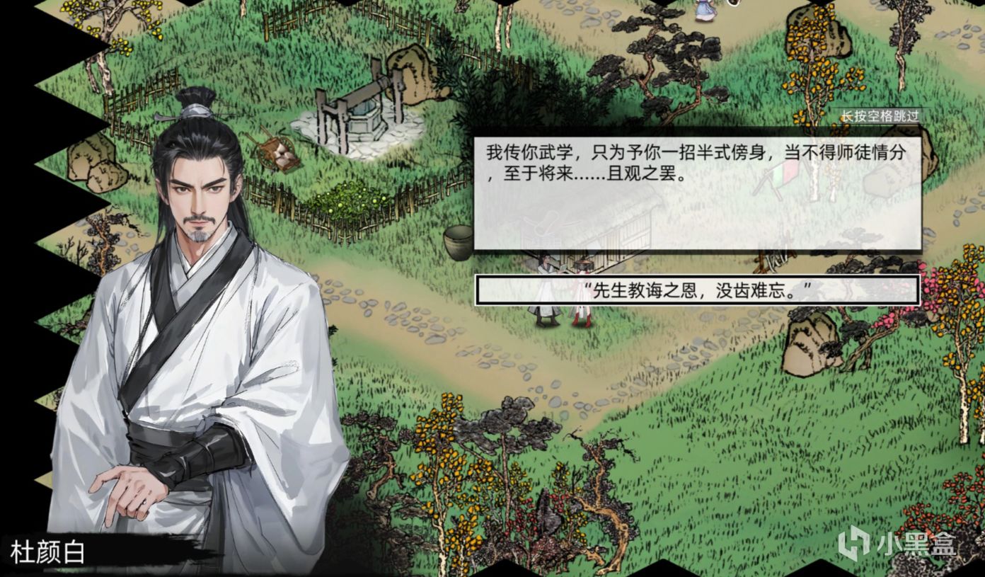在《刀劍江湖路》故事的一開始,我們在青萍村中醒來,身邊是一位武藝超凡的大俠杜顏白(1.0立繪比之前帥了很多)。