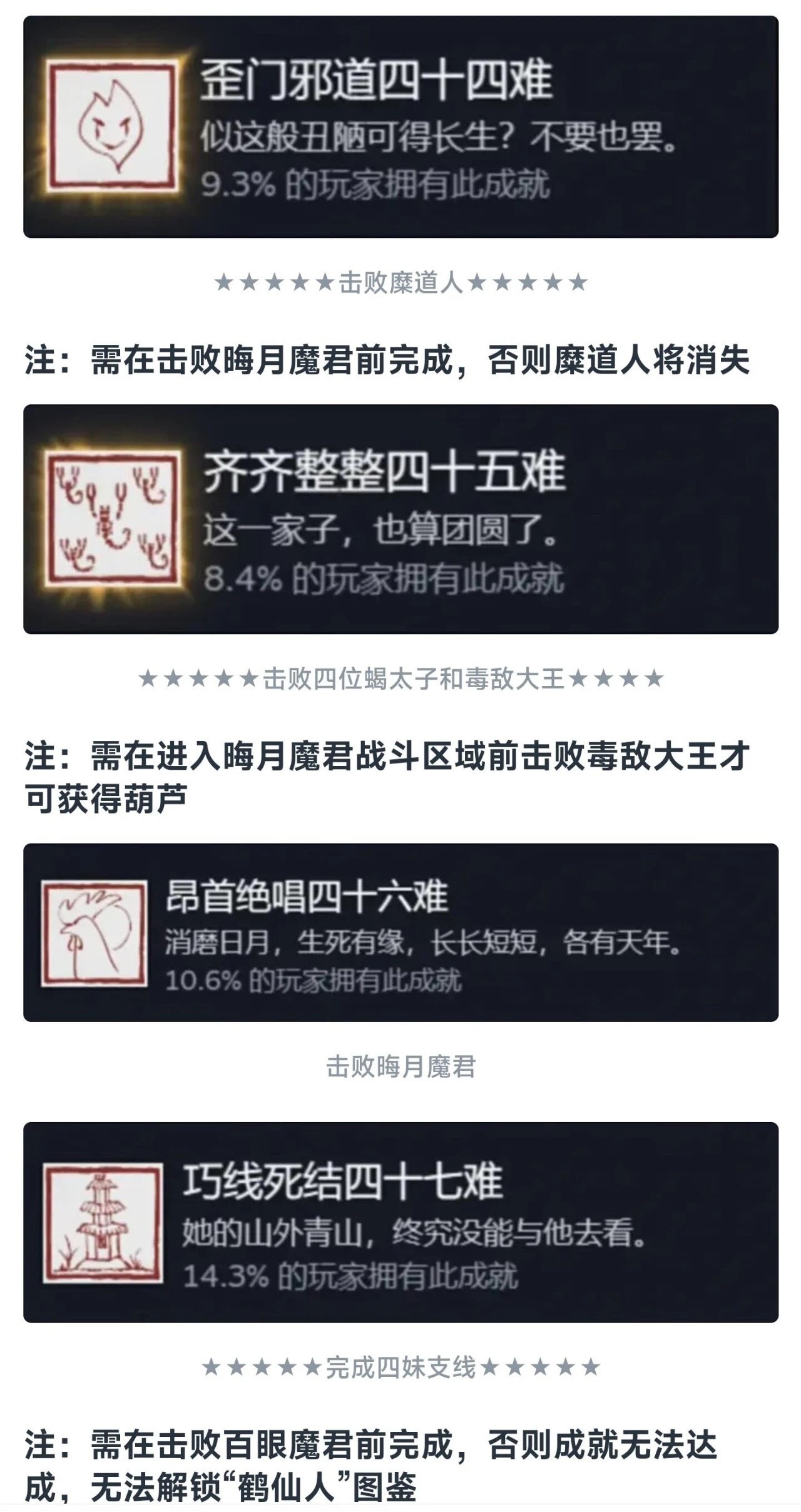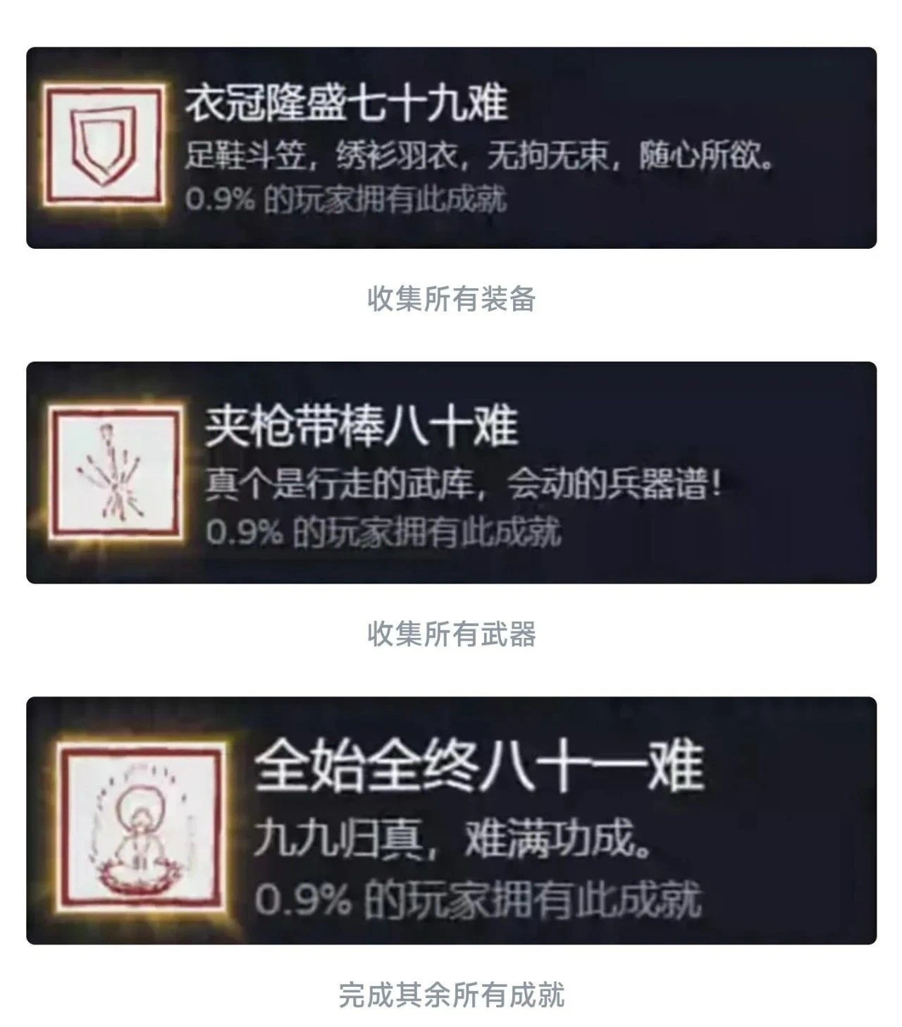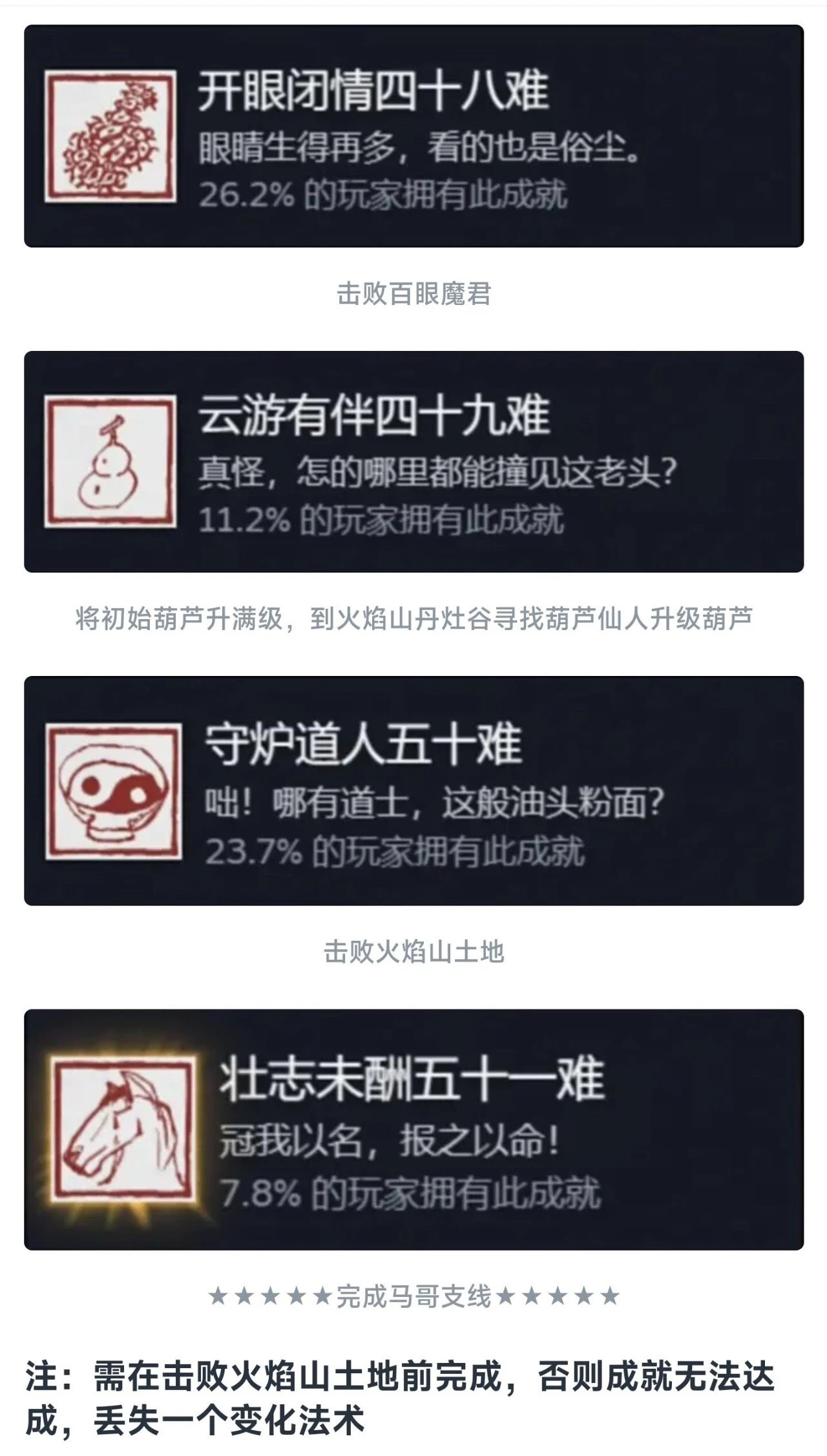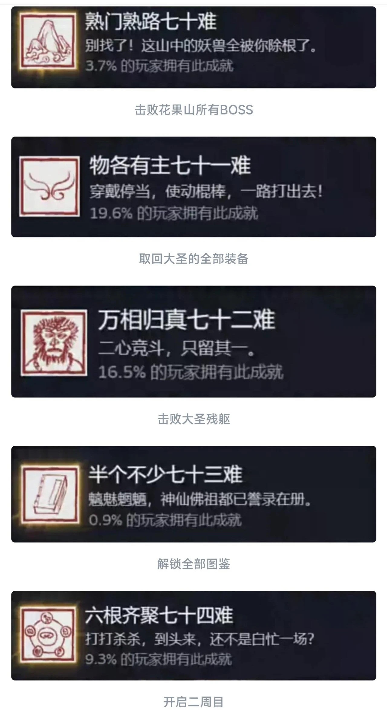 同理这个九九八十一难等于在官方层面的全收集成就就彻底达成了!还是值得每个玩家去够一够的,基本上在二周目就可以搞定!如果对游戏热情不大,也就不需要玩到4周目以后。七十二难前的成就皆可在一周目完成,剩下的成就需进入二周目后完成!最快全成就的节点是二周目击败『璧水金睛兽』后!
