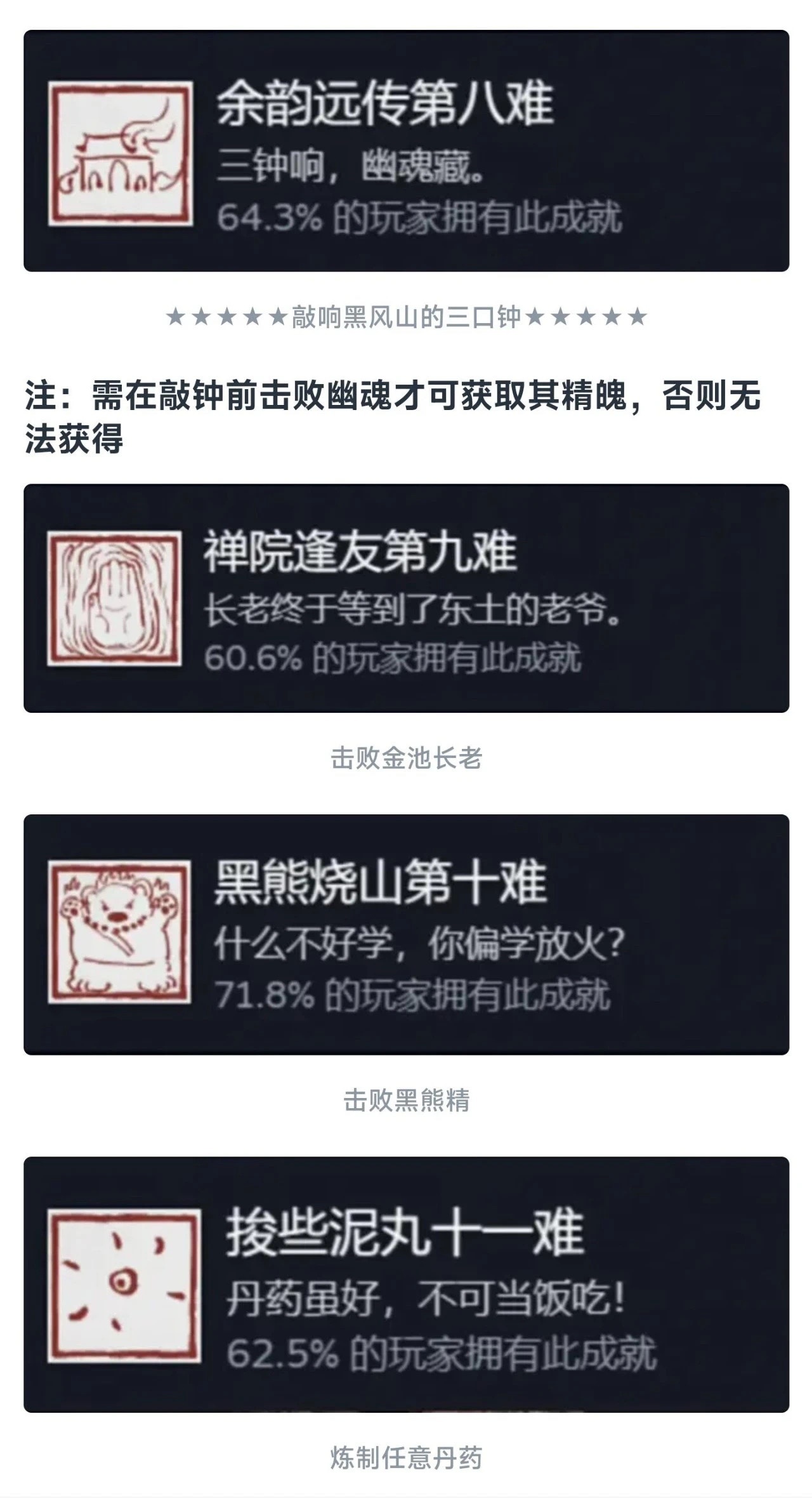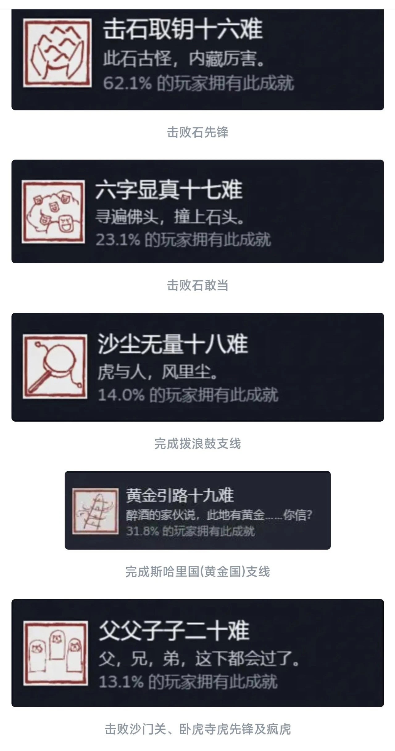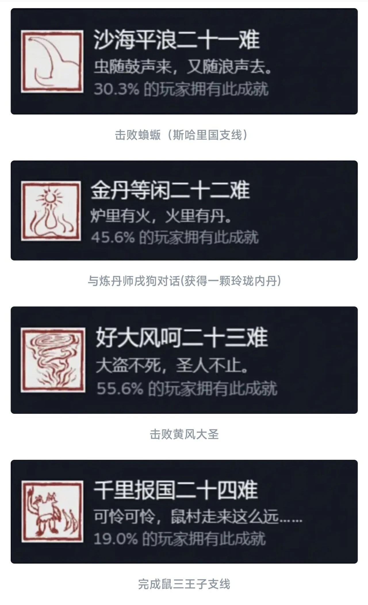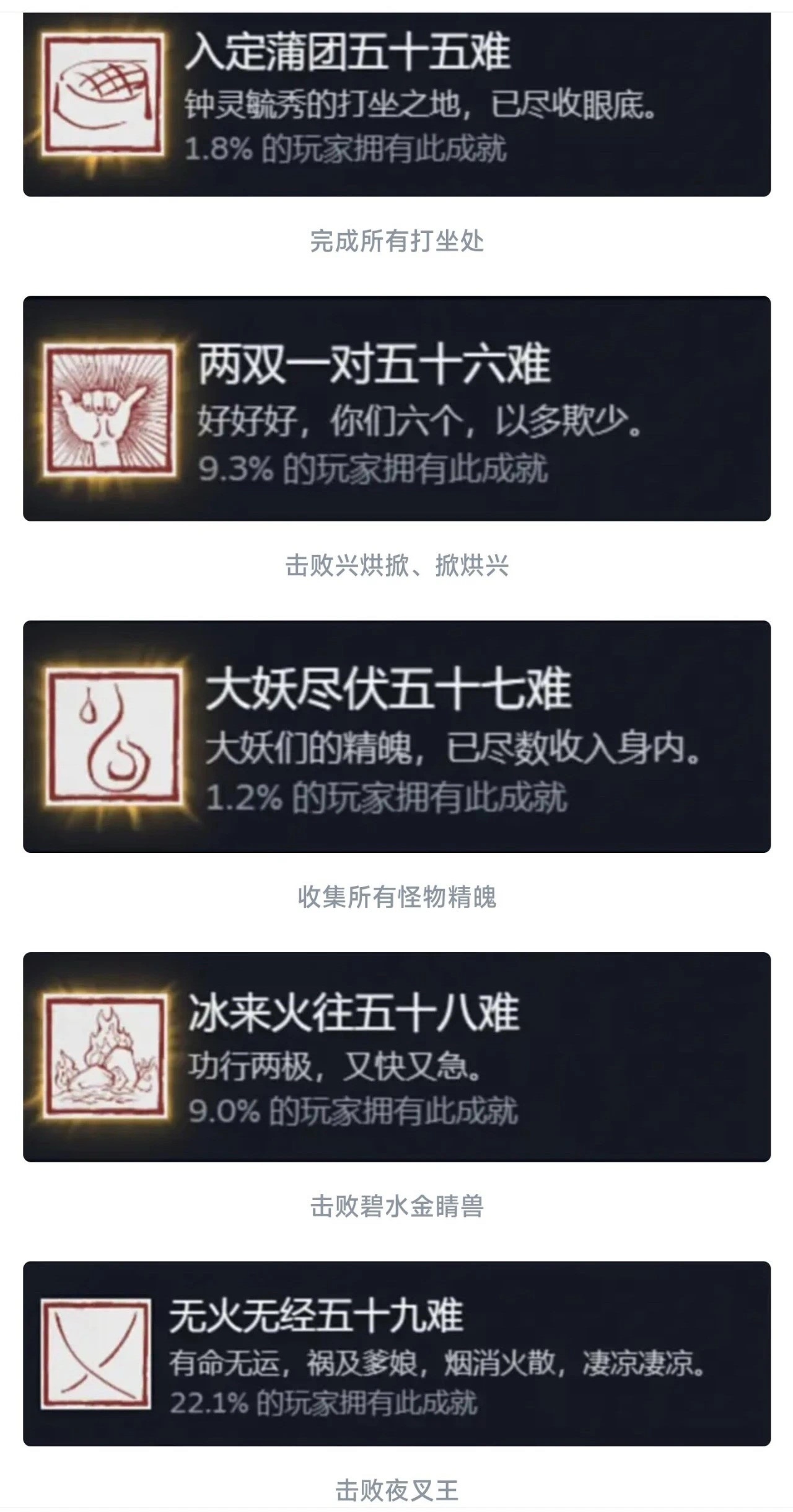 同理这个九九八十一难等于在官方层面的全收集成就就彻底达成了!还是值得每个玩家去够一够的,基本上在二周目就可以搞定!如果对游戏热情不大,也就不需要玩到4周目以后。七十二难前的成就皆可在一周目完成,剩下的成就需进入二周目后完成!最快全成就的节点是二周目击败『璧水金睛兽』后!