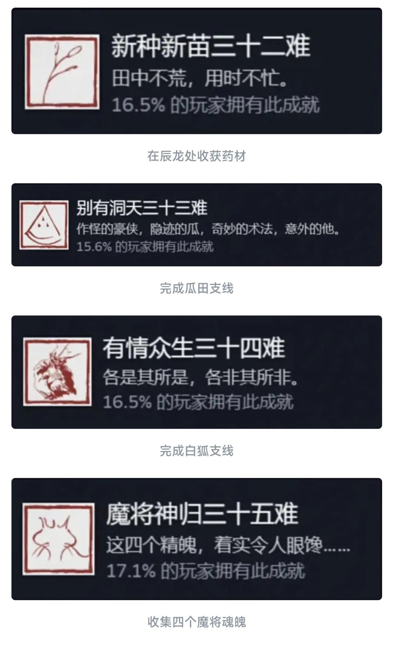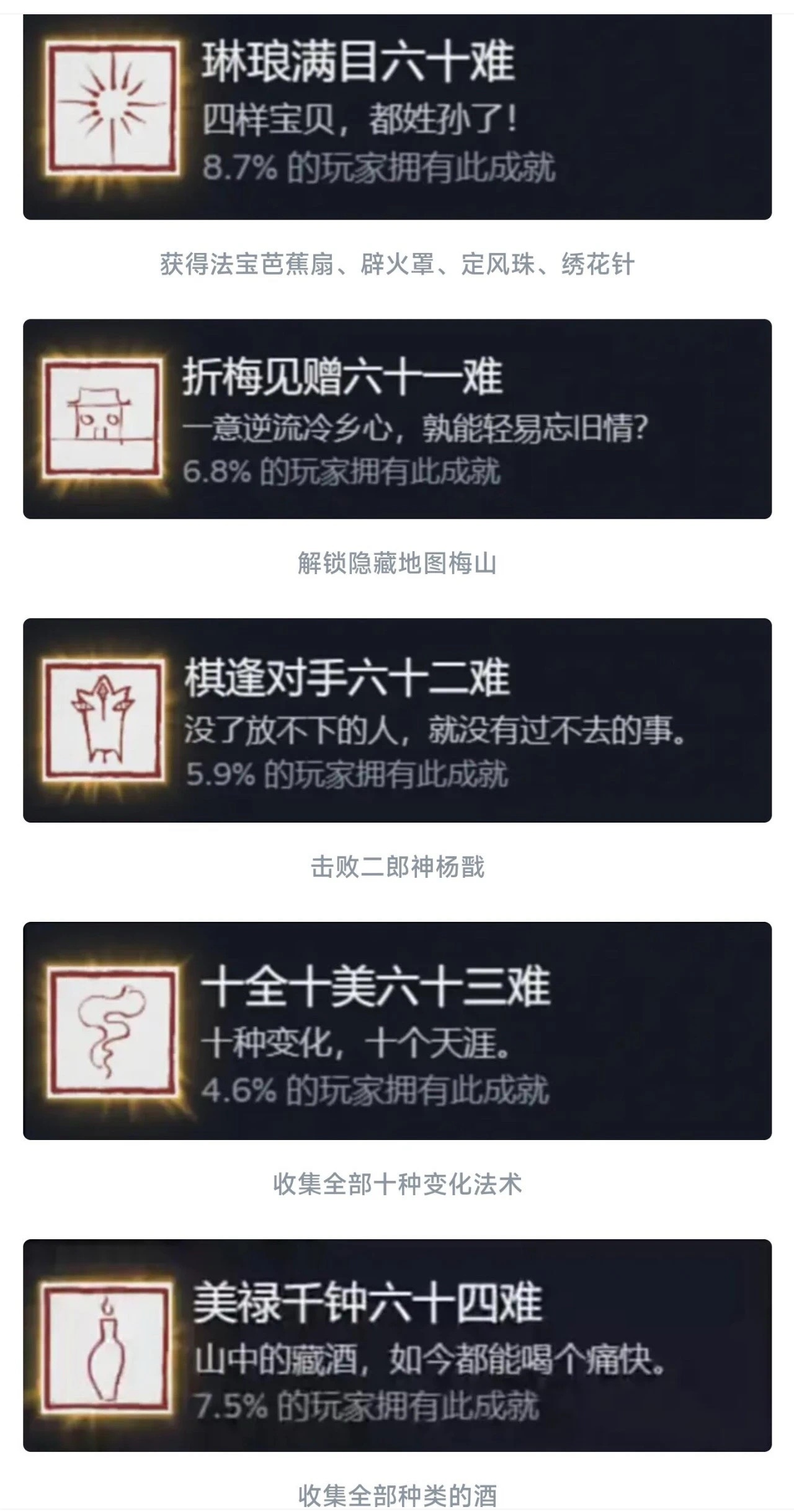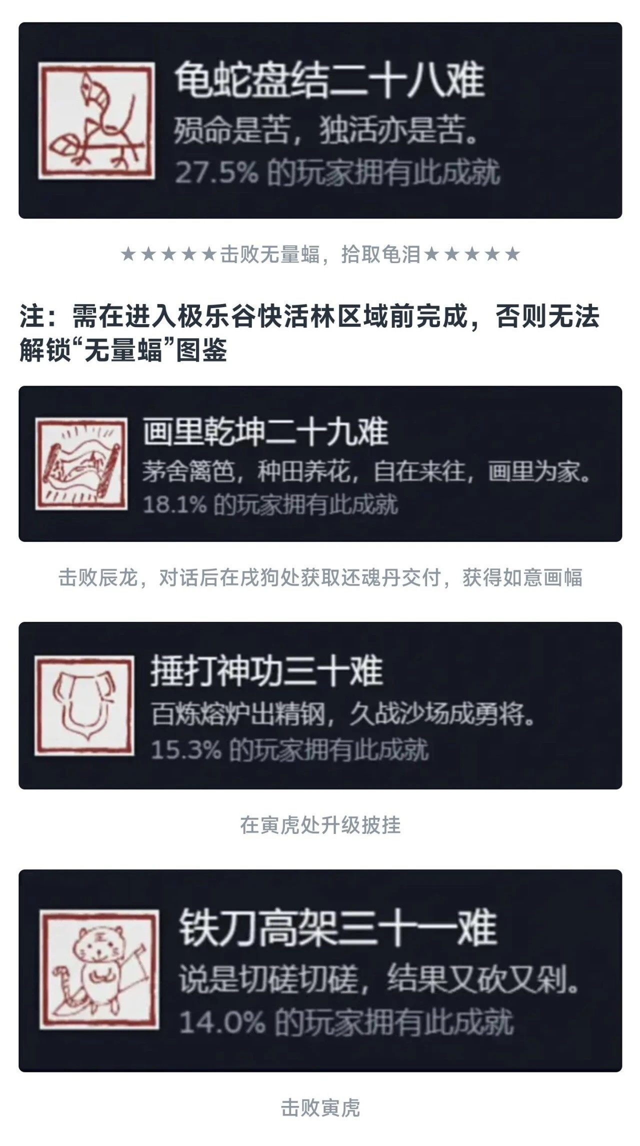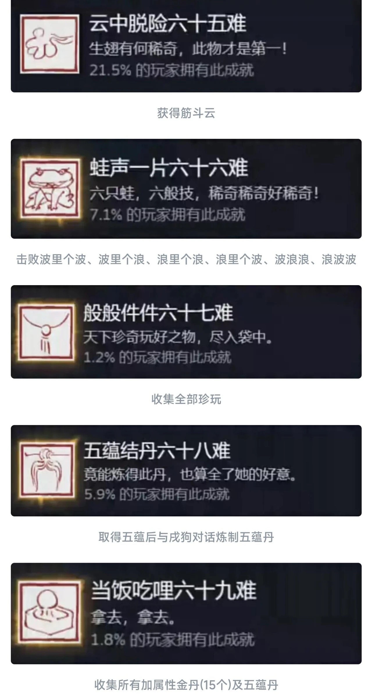 同理这个九九八十一难等于在官方层面的全收集成就就彻底达成了!还是值得每个玩家去够一够的,基本上在二周目就可以搞定!如果对游戏热情不大,也就不需要玩到4周目以后。七十二难前的成就皆可在一周目完成,剩下的成就需进入二周目后完成!最快全成就的节点是二周目击败『璧水金睛兽』后!
