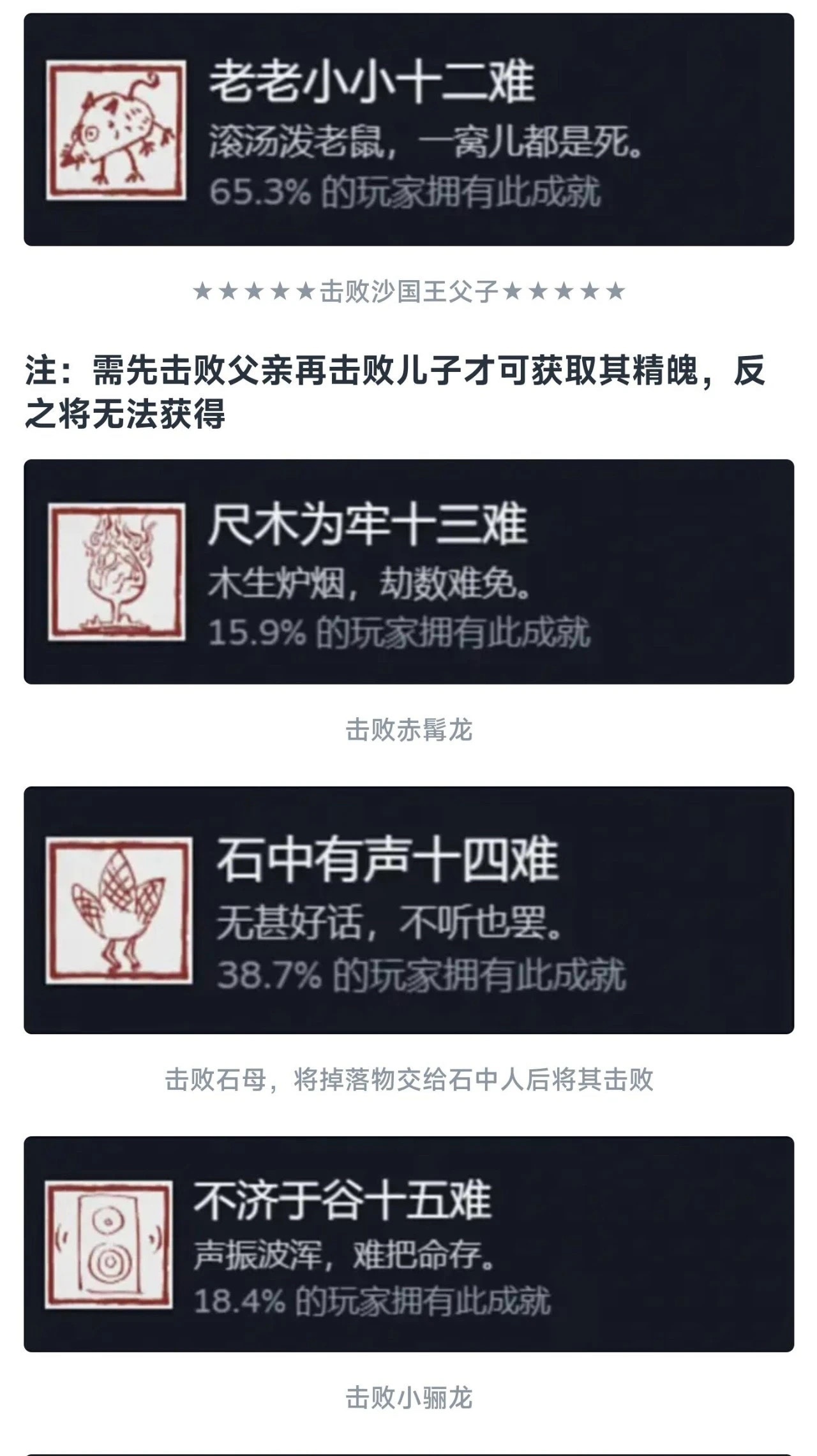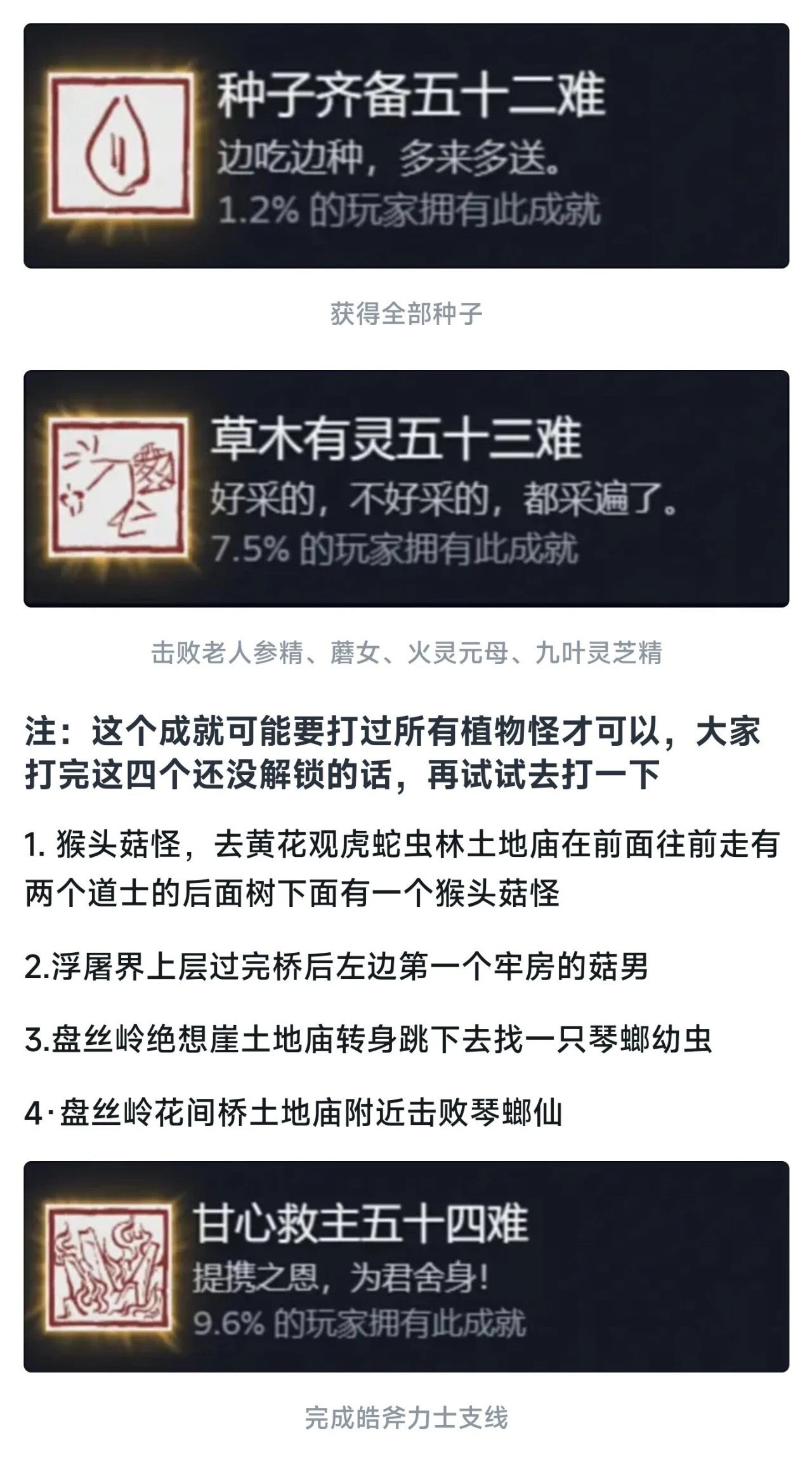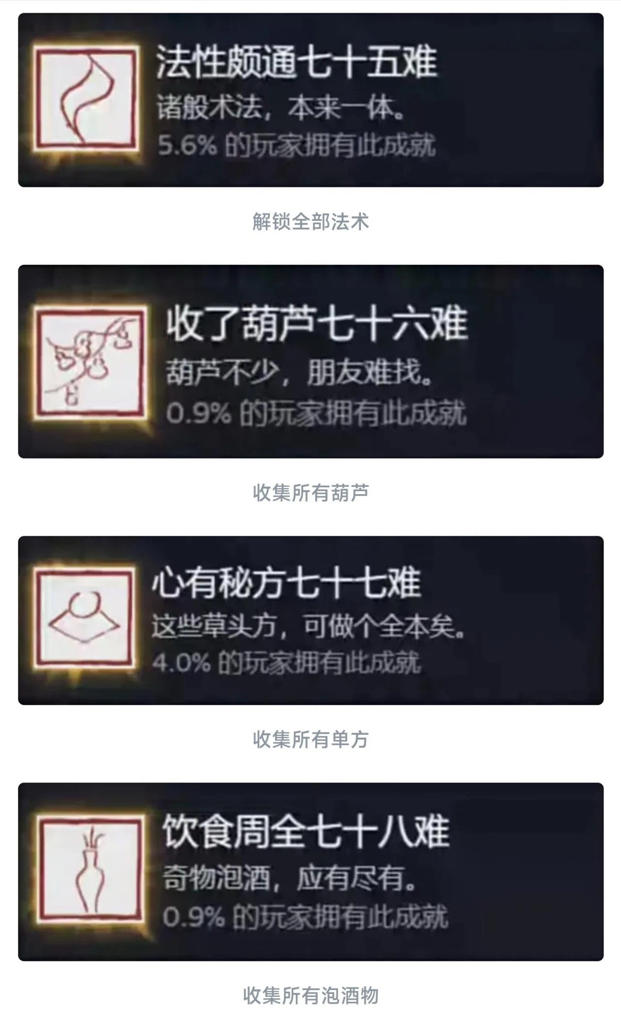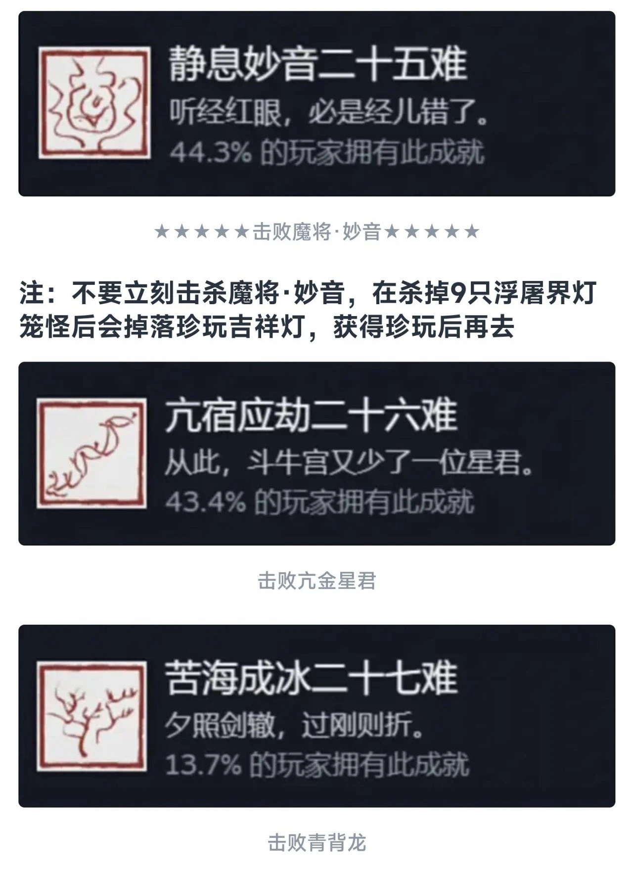 同理这个九九八十一难等于在官方层面的全收集成就就彻底达成了!还是值得每个玩家去够一够的,基本上在二周目就可以搞定!如果对游戏热情不大,也就不需要玩到4周目以后。七十二难前的成就皆可在一周目完成,剩下的成就需进入二周目后完成!最快全成就的节点是二周目击败『璧水金睛兽』后!