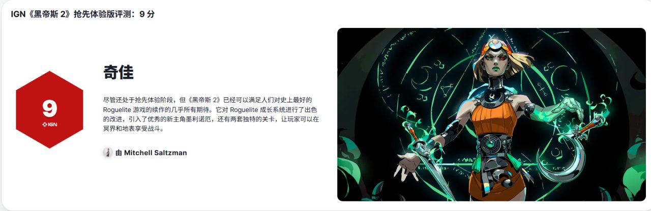 IGN高分评价:IGN为本作给出了9分的高分,认为《黑帝斯2》在战斗和进程上进行了出色调整,功能是前作的两倍,尽管目前有一些美术资源和武器内容尚未完成,但整体体验仍然令人惊艳