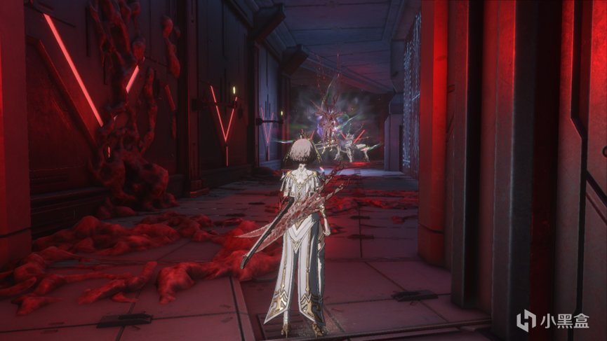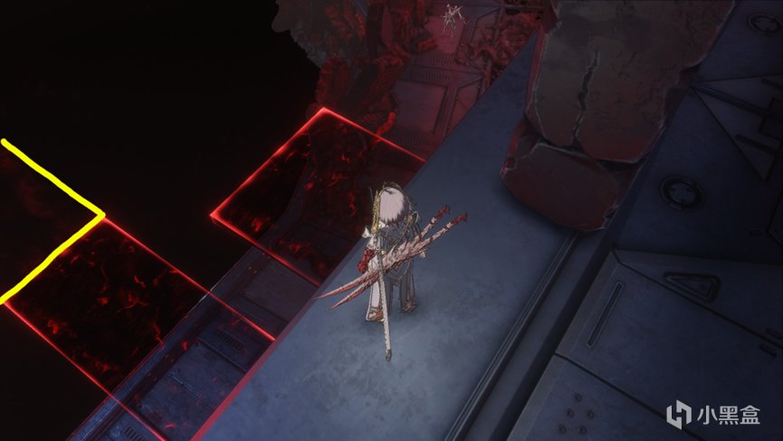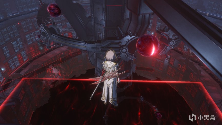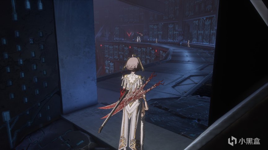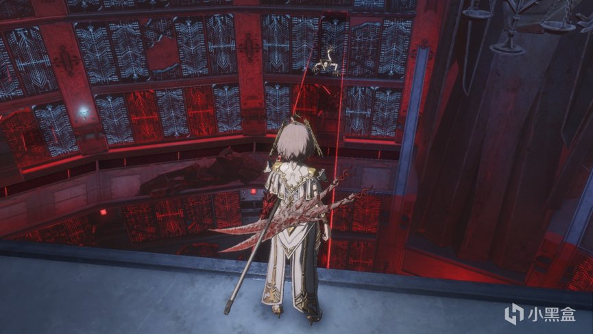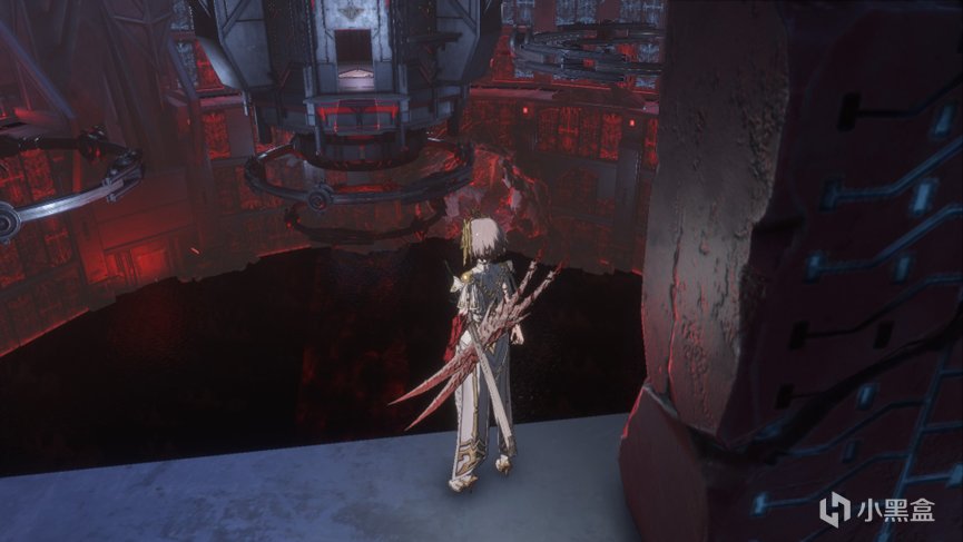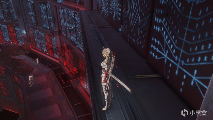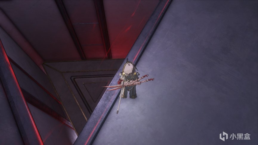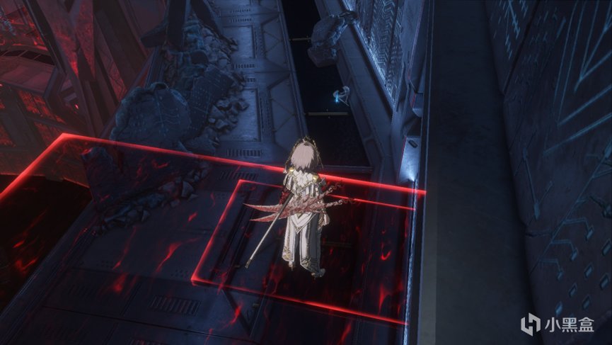 於是玩家只得原路返回,先去第3層與夾層相對的另一側(見圖6)。打敗敵人後,可以看到掩體旁有一個紅色和剛纔從高處下落時同樣的紅色透明平臺,但這這個紅色透明平臺的功能是連接監視塔和靈龕邊緣的橋樑(見圖10)。並且從監視塔離開,前往與來時相對的靈龕邊緣平臺時,同樣會遇到作爲橋樑的紅色透明平臺(見圖11)。這時玩家便會注意到,紅色透明的平臺第二個功能,通過紅色透明平臺才的橋樑功能。