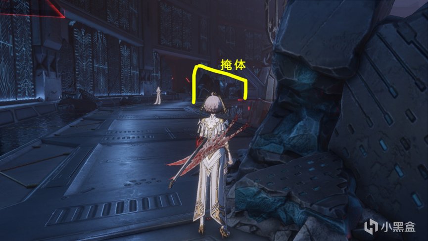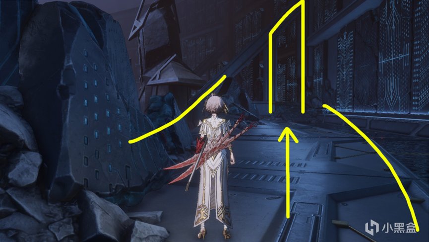 這個拾取就是在引導玩家躲在掩體後,以便躲避“索倫之眼”的監視。最關鍵的是,這個掩體是最近的掩體,不僅如此,這個掩體、拾取物和平臺的下落方向均是讓玩家進入掩體後面朝由石碑和牆壁構成的夾層的方向(見圖5)。