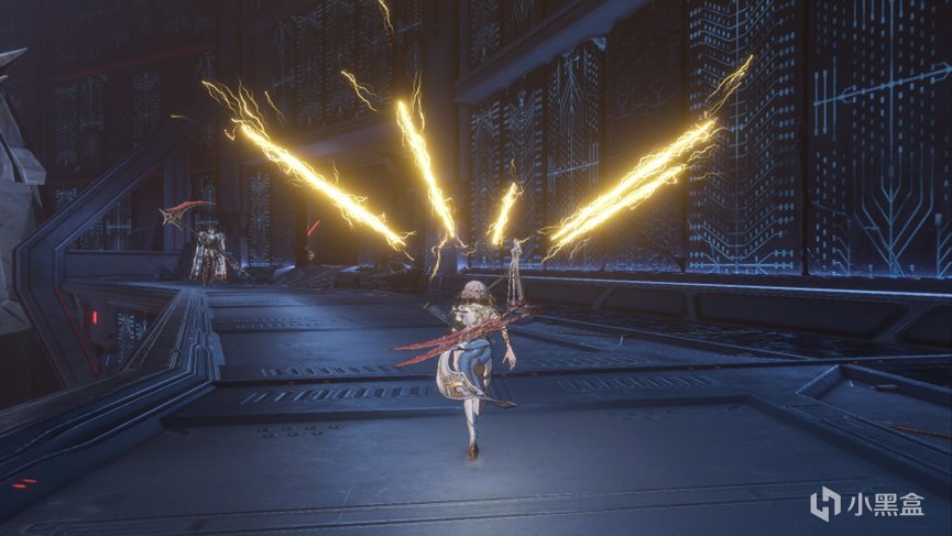 當玩家第一次下落到最後一個紅色平臺,或者直接落在第3層的平臺上時,很容易就會被自己被位於監視塔中央的“索倫之眼”監視並標記。隨後,周身依次被六根黃色雷電包圍(見圖3),如果及時不找到掩體,則不僅受到大量傷害,同時遭受長時間硬直。