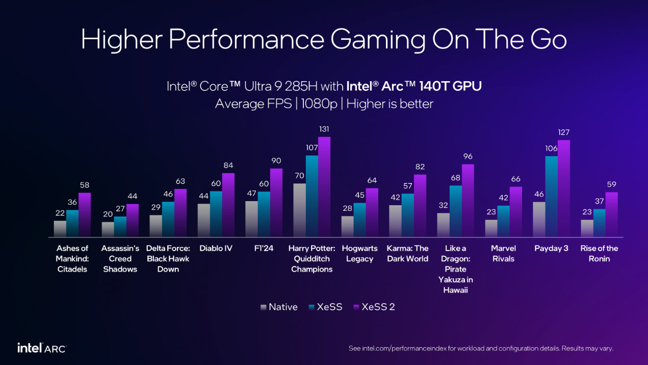 同樣,採用核顯的酷睿Ultra 200系列也獲得了XeSS 2的加持。以酷睿Ultra 9 285H爲例,核顯採用了英特爾銳炫140T GPU,在相同遊戲測試中,幀率穩定達到40幀以上,而多款大作輕鬆突破60幀。其中《漫威爭鋒》高畫質模式下幀率提升187%,從原生23幀躍升至XeSS 2加持下的66幀。