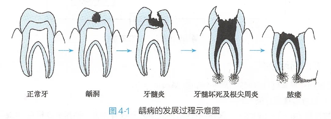 當一個牙齒髮生齲壞時,先是釉質脫礦化,形成透明度較低的白堊色病竈。此時由於釉質尚且完整,一般沒有明顯的感覺;隨着齲壞的進展,牙釉質出現齲洞,就會因爲暴露出牙本質而對冷、熱、酸、甜等刺激格外敏感;等牙本質也不再完整,暴露出牙髓時,牙齒就會變得格外敏感,輕微的刺激即可引發劇烈的疼痛。如果發生急性牙髓炎,更是會有自發的尖銳疼痛,即便沒有外界刺激,也會有陣發性發作或者陣發性加重的疼痛,而且夜間往往更明顯。