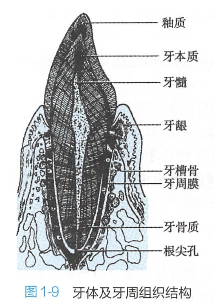 牙冠最外層是牙釉質,爲半透明的鈣化組織,是人體最堅硬的組織;釉質下面是淡黃色的牙本質,硬度低於釉質。牙本質裏面有痛覺感受器,受到刺激時會產生痠痛感;牙本質內是牙髓,爲疏鬆結締組織。牙髓中有豐富的血管、淋巴管、神經、成纖維細胞、成牙本質細胞等,主要作用是營養牙體組織,並可以形成繼發牙本質。牙髓神經對刺激異常敏感,稍受刺激即可引起劇烈疼痛。