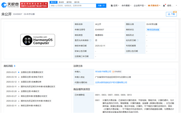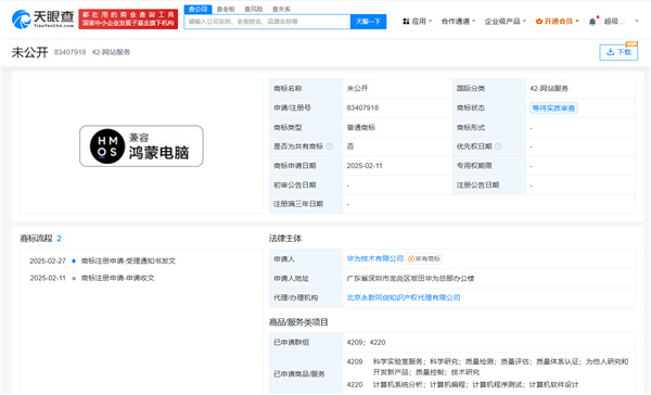 另外,天眼查知識產權信息顯示,今年2月,華爲技術有限公司已申請註冊多個“鴻蒙電腦”相關圖形商標,國際分類涉及網站服務、廣告銷售、科學儀器,當前商標狀態爲等待實質審查。