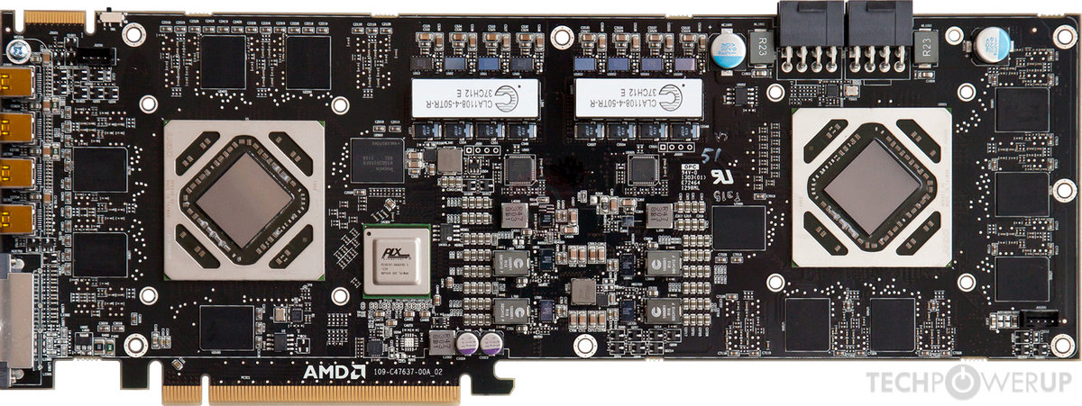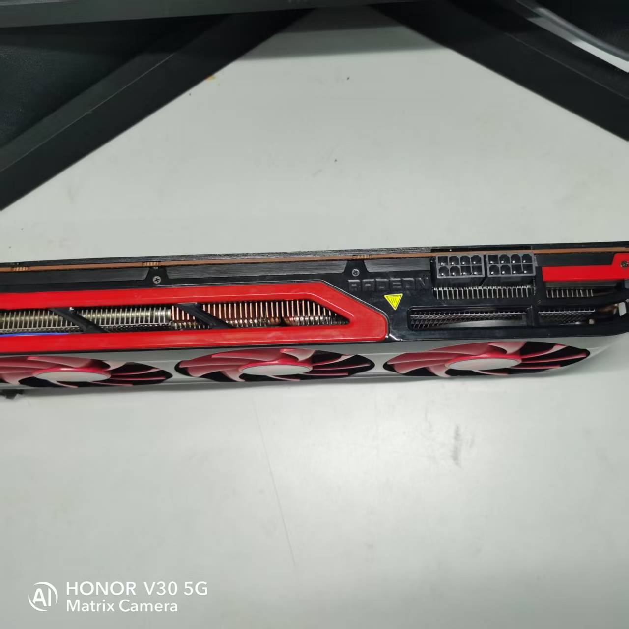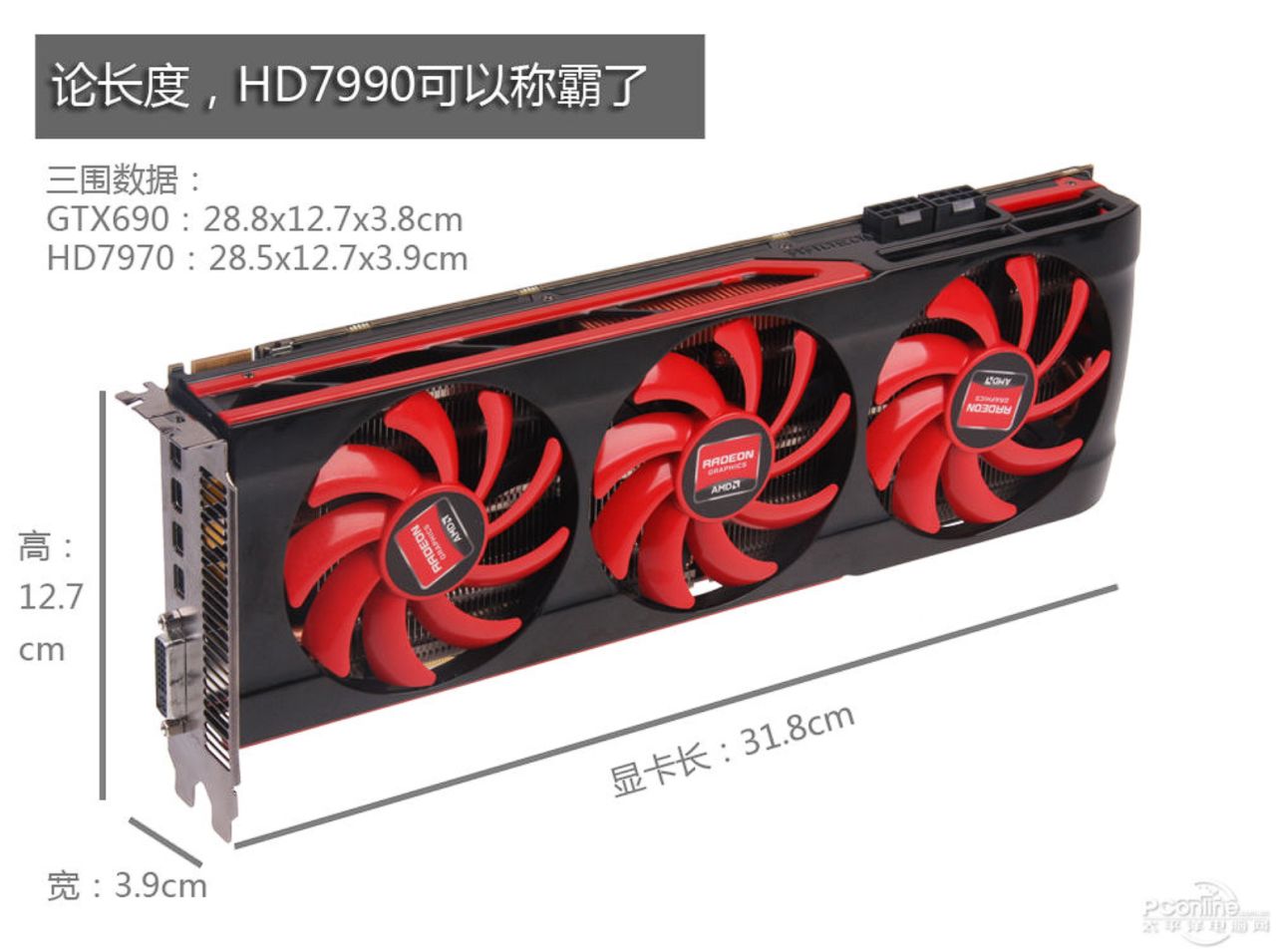 作为一张首发7999元的显卡,曾经甚至有工程卡被炒到60W,其外观单纯看上去还算可以,贯彻了AMD一贯的红黑配色设计,不过风扇不是很对我胃口,可以看到其有3个8cm(其实感觉有9cm多)大风扇,以满足其两个Tahiti XT核心的猛火炙烤,同时可以看到其整体成型背板,可以起到支撑与辅助散热的功能 (带一提lz这张卡还有一个支架,猜测应该是某oem厂定制在装到机箱后可以固定支撑用)
