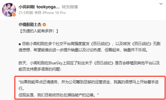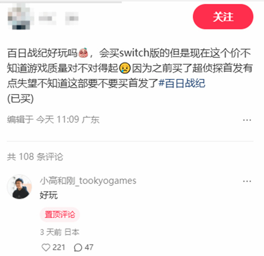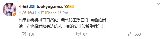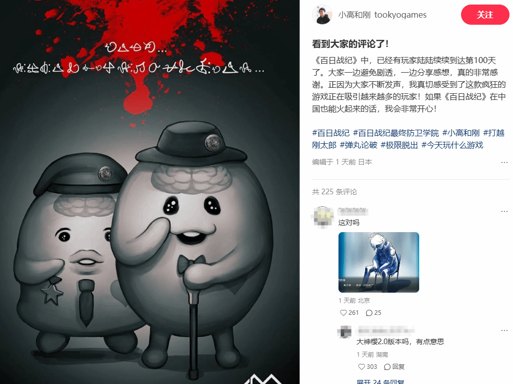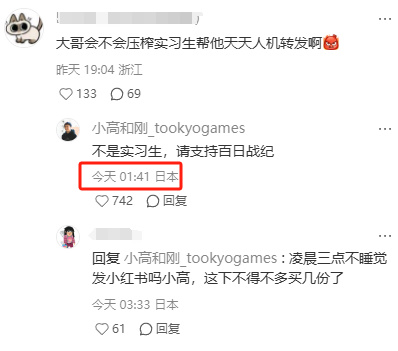 小高和剛的做法是:凌晨1點多上去給人回覆一句“不是實習生,請支持《百日戰紀》”。