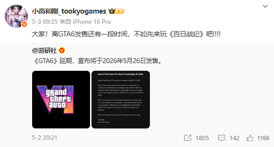 前兩天GTA6跳票,小高在轉發消息的同時,也不忘貼心的提醒大夥: