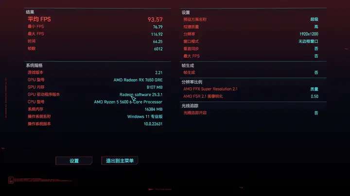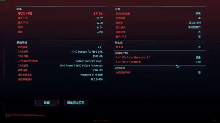 賽博朋克2077,2K分辨率超級畫質。跑基準測試約65幀,滿足暢玩標準: