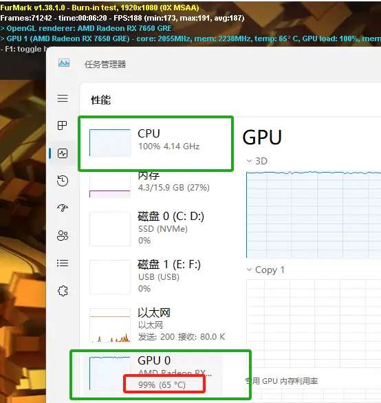 很多萌新擔心小機箱溫度高,實際極限全密閉雙烤時,CPU溫度在70°C,顯卡溫度65°C: