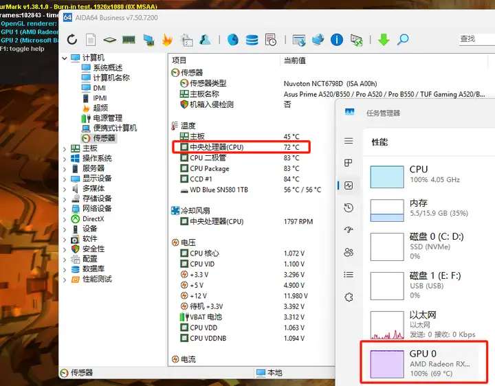 我把風扇拔掉又烤機測試,此時CPU溫度在72°C,顯卡69°C,其實加不加都行: