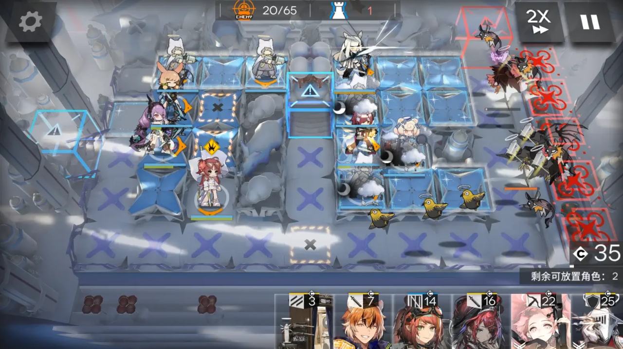 一定要多帶個對空的,因爲能天使那邊沒對軸,最後是在能天使下面一格極限擊殺突襲的薩科塔昂首。需要多帶個能打到棘刺那排的對空打手。依次部署能天使朝左,藍毒朝左,棘刺朝左,白金朝左,拉普朝左,流明朝下掛機。