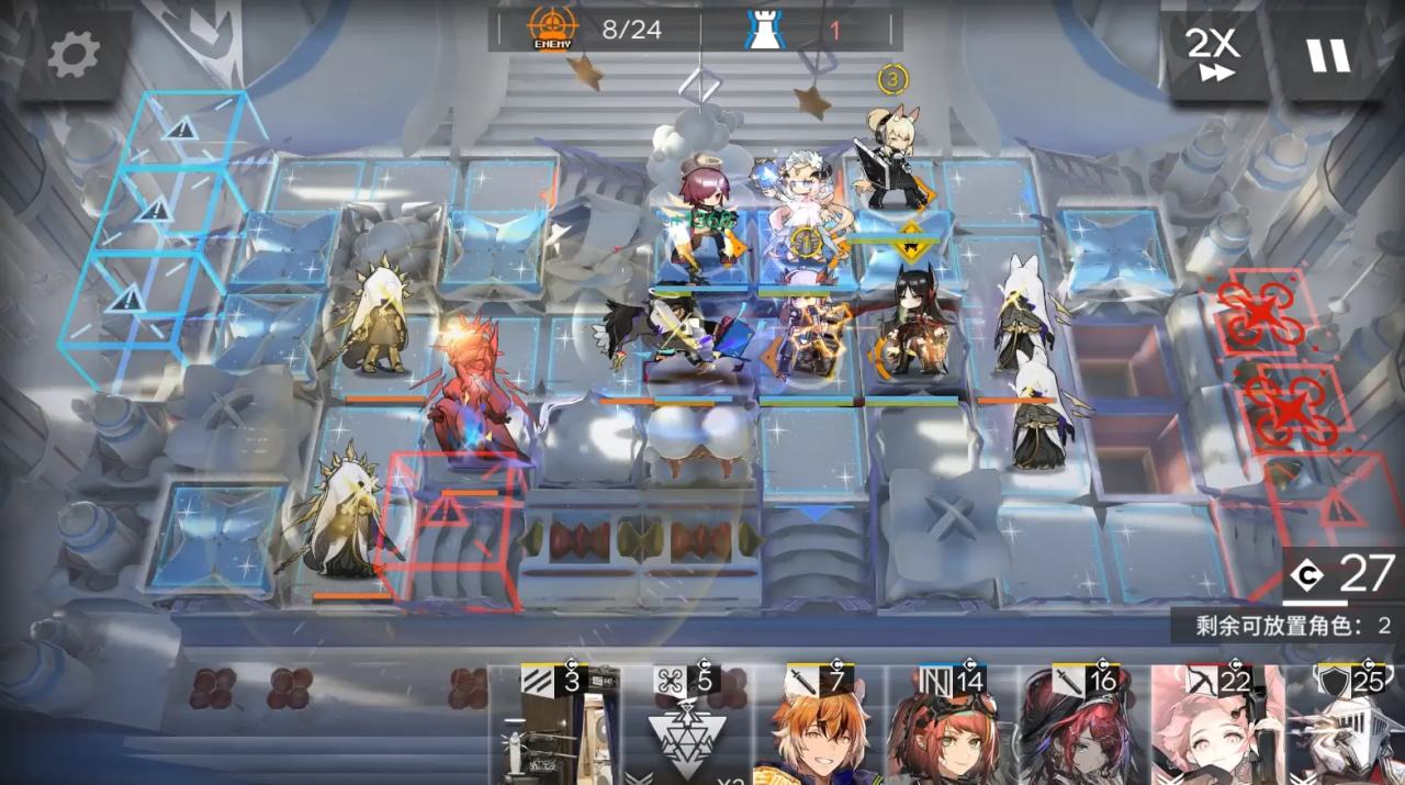 醫療需要奶住星熊,對面在門口一直疊攻擊,建議先找人切掉會簡單,但是注意能天使最後需要幫忙。先隨便在藍門口放先鋒,然後能天使朝右,粉毛朝下,流明朝下,棘刺朝右,星熊朝右,塞雷亞。之後棘刺開完第一次技能掛機,剛好在能天使沒有過載的時候打死薩科塔見證。