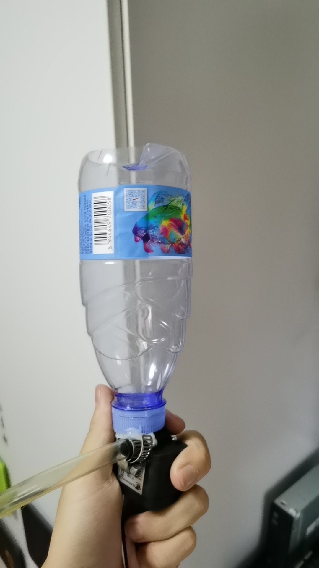 然后是泵箱,本来想买个新的,但是泵箱这玩意嘛大家看过的都懂(口瓜!又是我买不起的东西口牙!)寻思了一番,👆🤓欸!俺不是还有个鱼缸水泵么!进行了一番抽象改造,把鱼缸水泵改成了电源大4pin供电,泵的问题解决了,那么箱呢?欸!矿泉水瓶不有的是嘛!粘上去不就完了!然后得到了这么个抽象玩意: