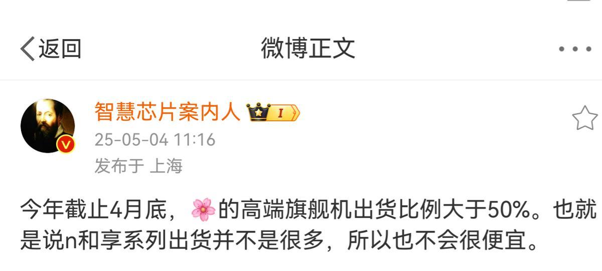 华为3款机型销量排名前15,中低端占据两款,是不是说明第一季度华为中低端机型销量更大,其实并不是。根据博主“智慧芯片案内人”的爆料,2025年1-4月,华为高端手机占比超50%。