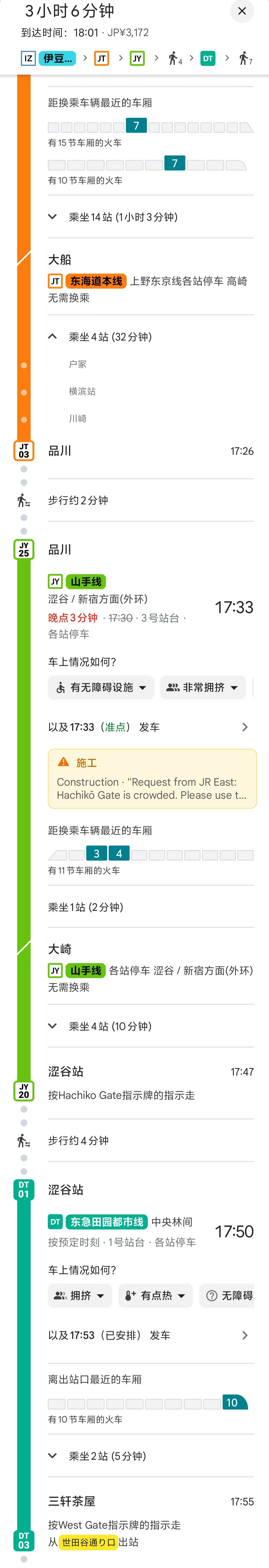 谷歌地图会将乘坐的价格、路线、电车线路简称及颜色、车站编号都显示出来,查看十分方便(没有谷歌地图真的感觉会迷路)。其中JT、JY、DT等这类就是JR东日本公司和东急电铁系统的路线简称,后面的数字表示各车站编号。例如JY01:品川站(山手线起点)。涩谷站在东急田园都市线中是:DT01,在山手线中是:JY20。