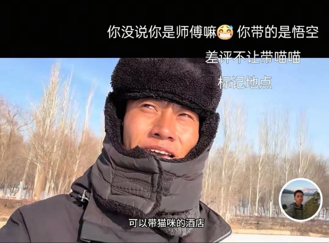 但有了悟空之後,他火速升級裝備:貓揹包鋪小被子、驅蟲藥配定位器,甚至爲了一口羊肉湯專程住賓館。