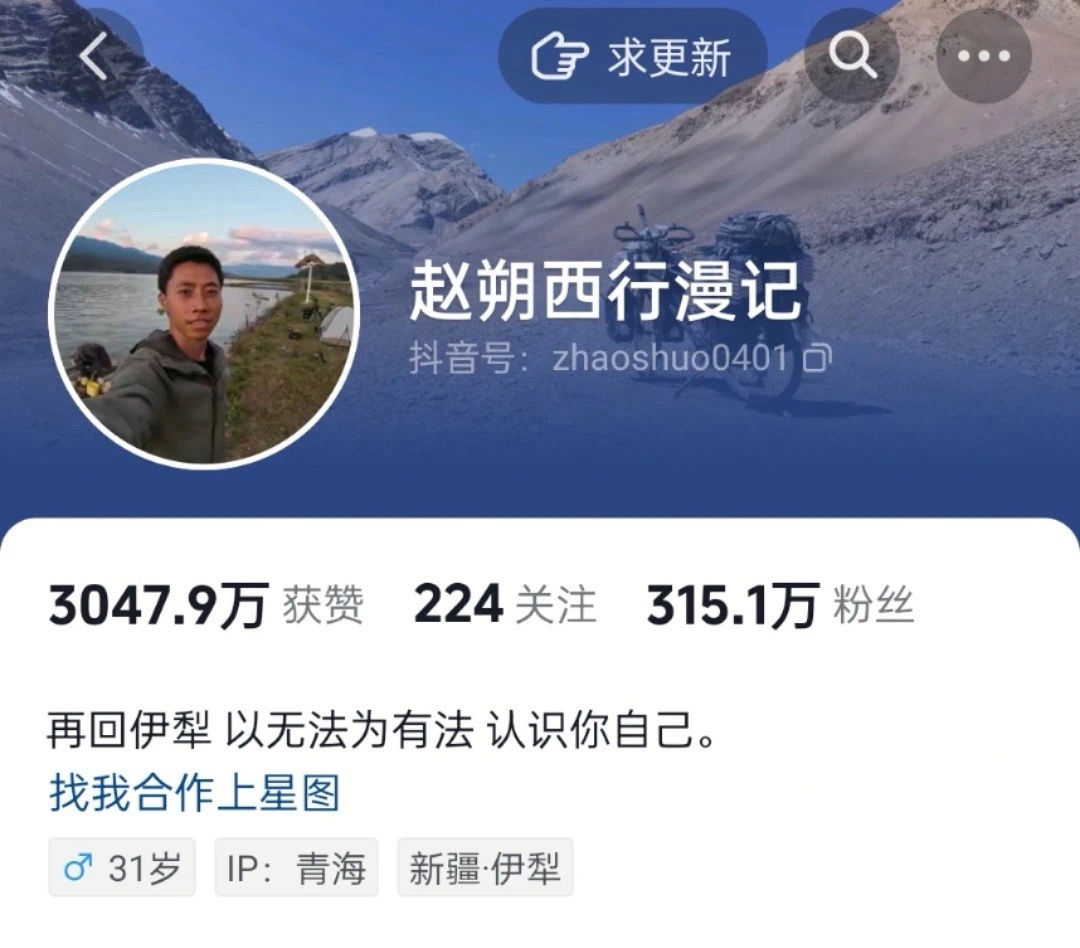 趙朔 ,是一位騎行博主,賬號名字叫趙朔西行漫記 。