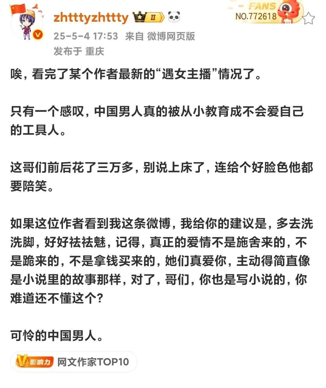 白金作家Zhttty锐评:“中国男人被教育成不会爱自己的工具人,建议多洗脚祛魅。”