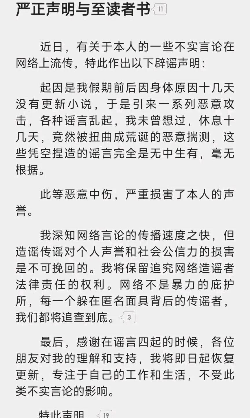 他专门发布单章,称谣言散布非常广泛,自己的名誉搞到了损害,要进行追查和维权。
